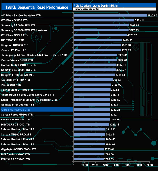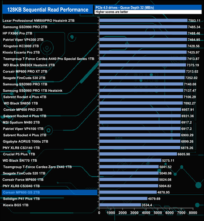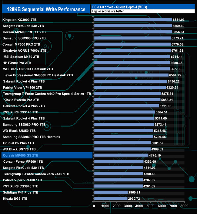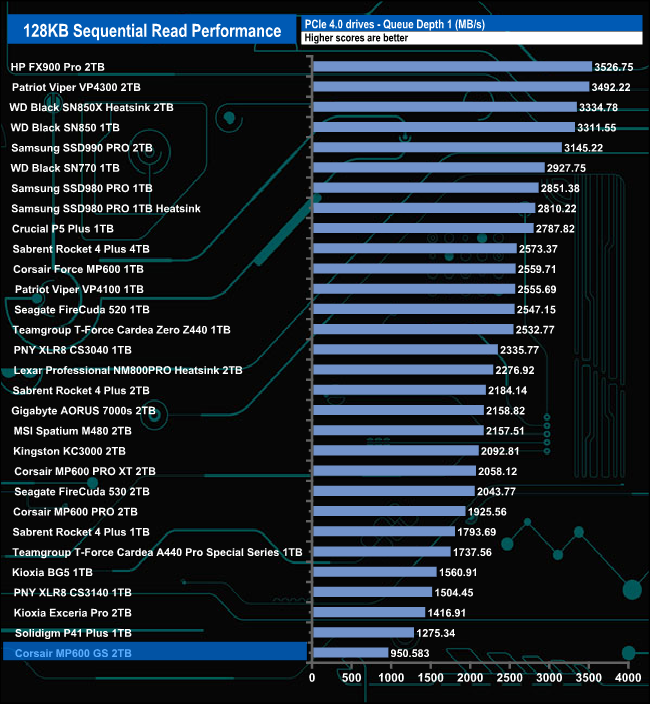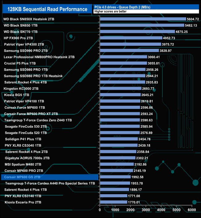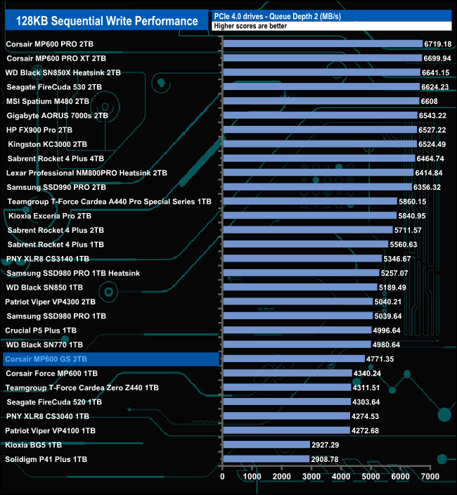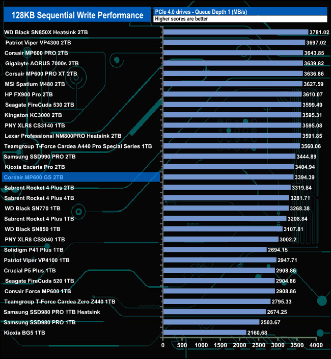 The MP600 GS performs best (at the tested queue depths) in relation to drives around it, at QD4 (3,327MB/s). At QDs 1, 2 and 32, it languishes near the bottom of our results chart.