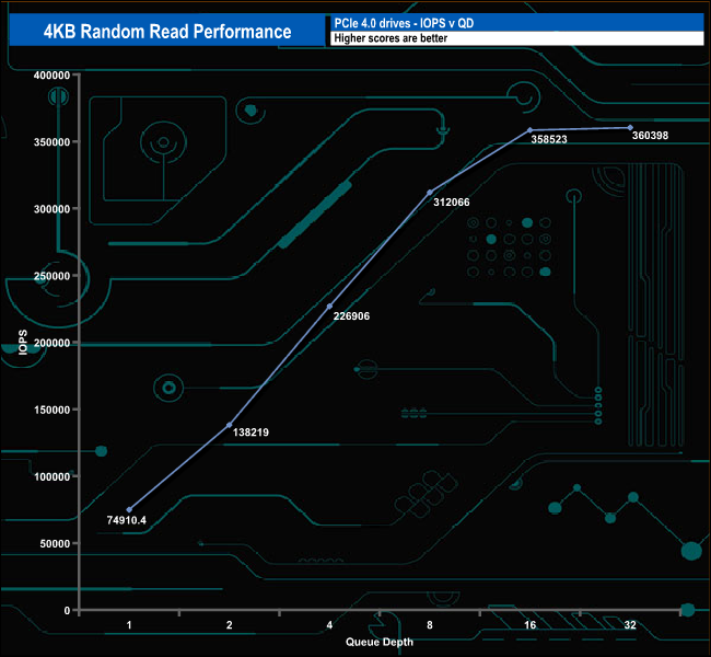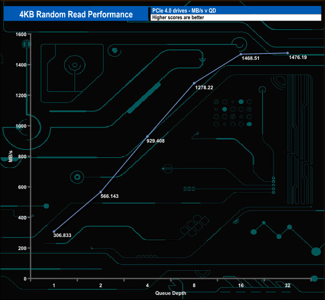 We used CrystalDiskMark 8‘s custom settings to test the 4K random read performance of the drive through a range of queue depths. The setup for the tests is listed below.