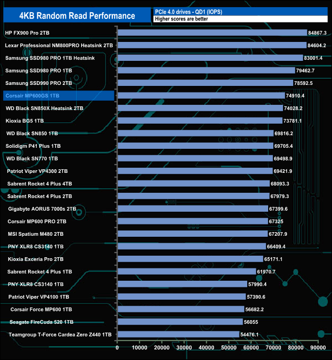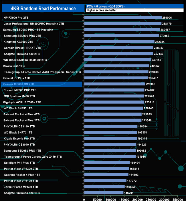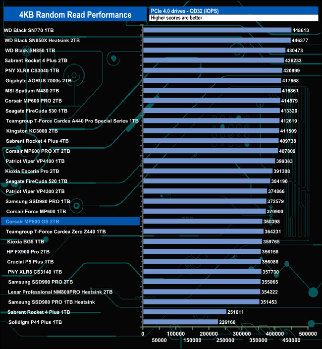 Corsair rate the 4K random read performance of the 2TB MP600 GS as up to 530K IOPS. With our 4-threaded testing, we couldn't get close to that figure, the best we saw was 360,398 IOPS (QD32). We ran a quick test of the drive using eight threads and got a result of 573,107 IOPS, confirming the official figure.