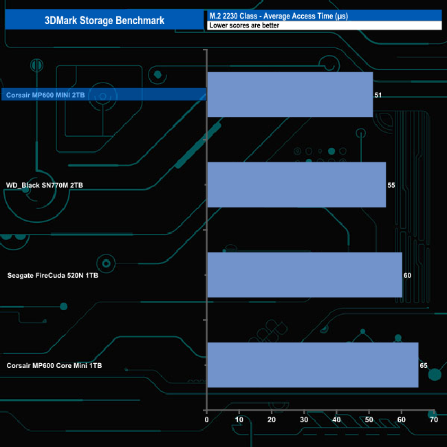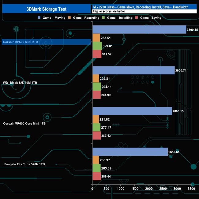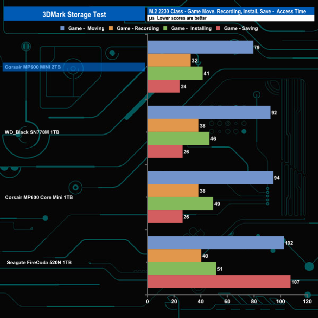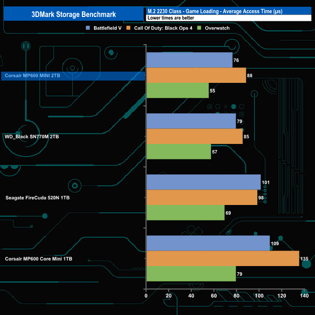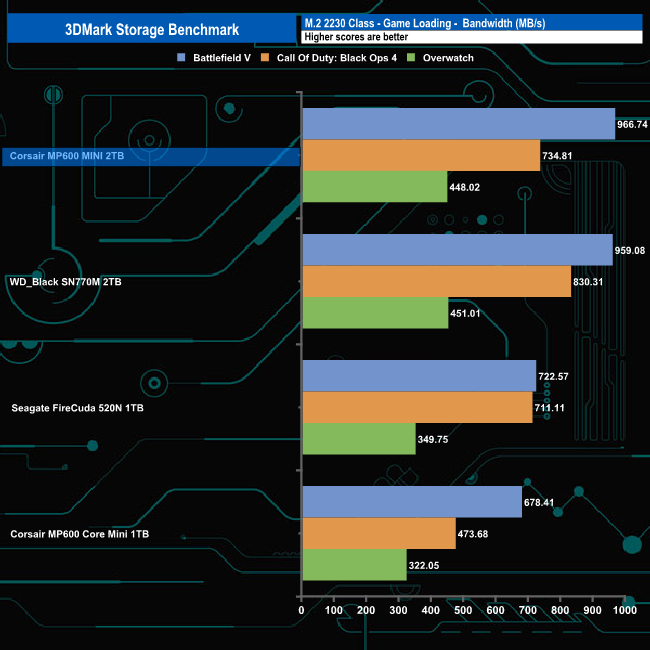 In 3DMark's Storage Benchmark Game Loading test, the 2TB MP600 Mini averaged 716.52MB/s for the three-game loading tests with an average time of 73 µs.