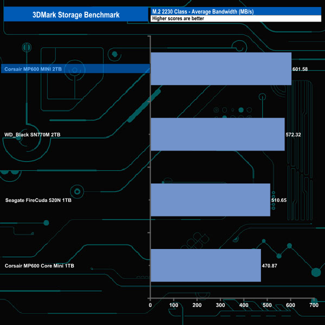 The average bandwidth figure for the complete test run for the drive was 601.58MB/s, a score that sees the 2TB Corsair MP600 Mini comfortably on top of the results chart.