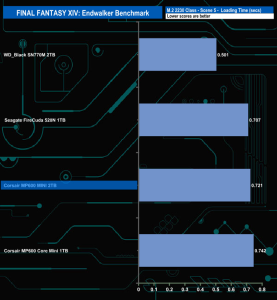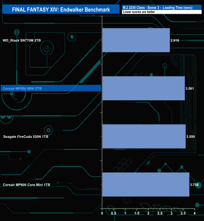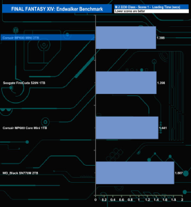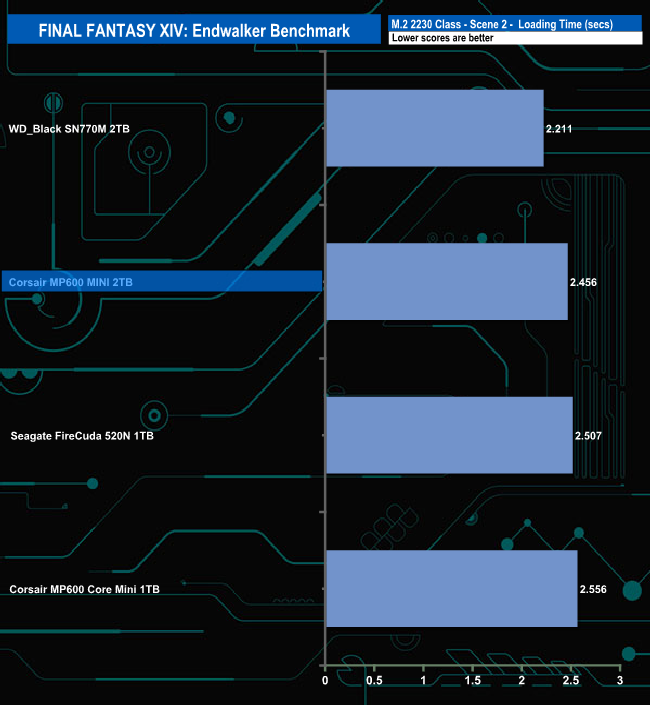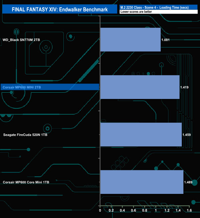 Corsair's 2TB MP600 Mini performance in the Final Fantasy XIV Endwalker Official Benchmark isn't too bad as it ends up in the second spot on the Total Loading Time chart behind the WD Black SN770M. It tops one of the individual load scenes (Scene 1) and sits in the second spot in three more (2, 3 and 4). The fifth scene sees it dropping to third place.