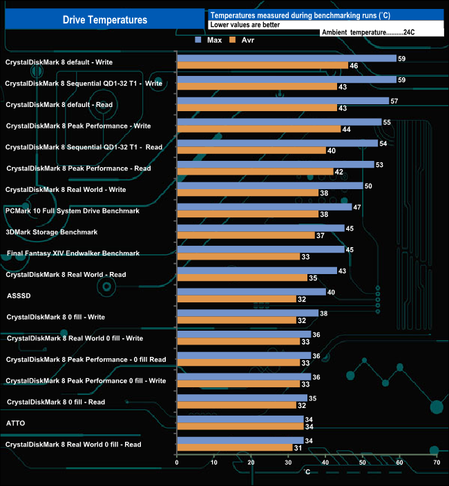The test Corsair's 2TB MP600 Mini we had to use an adapter because of its M.2 2230 format. The Sabrent EC-PCIE comes with an aluminium heatsink and thermal padding to help keep any drive inside cool and it works quite well. The hottest the drive got was when it was being pushed very hard during the Sequential write test using CrystalDiskMark8 (QD1-32 T1), and the default write test when it peaked at 59° C which is a little too close to the quoted maximum operating temperature of 65°C for comfort. Overall the drive averaged 45°C for the tests.
