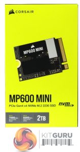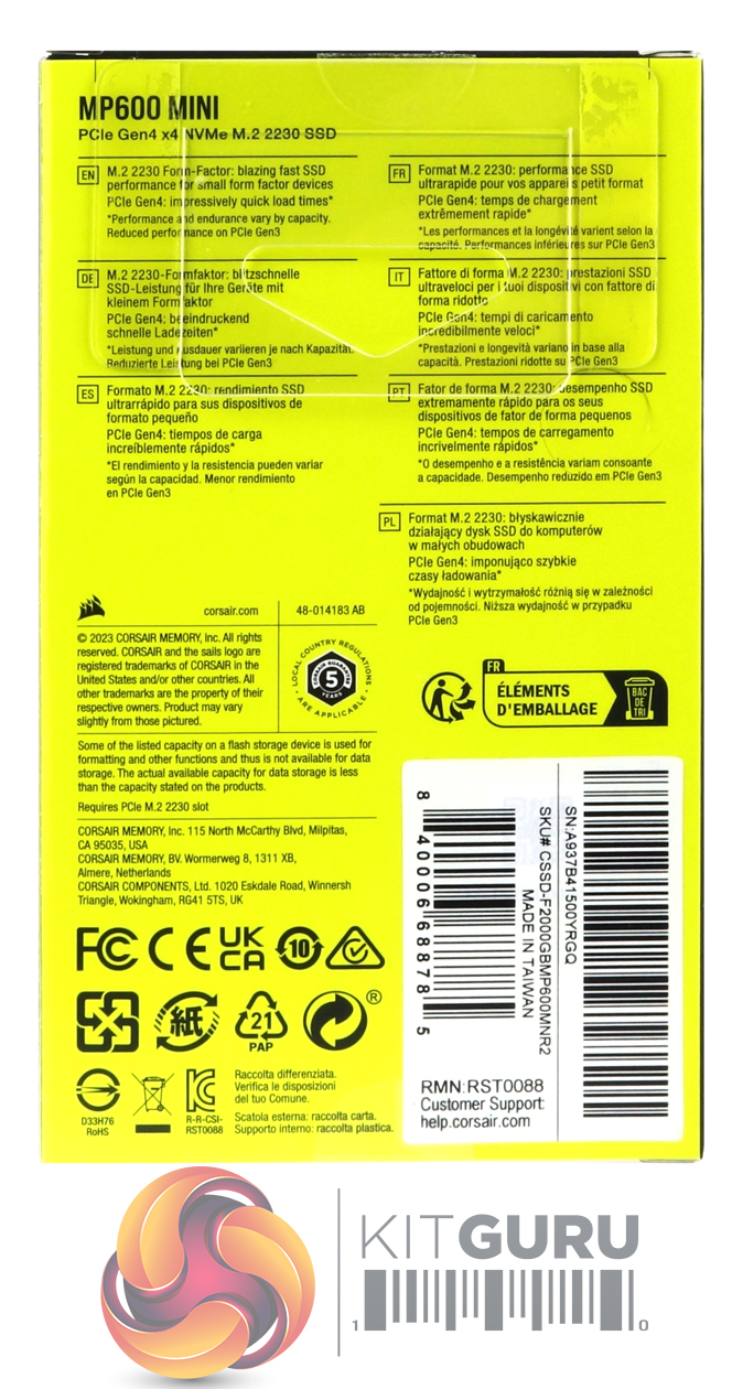 The MP600 Mini 2TB comes in a very compact box with a clear image of the drive on the front. Under the image is a strip label with performance figures for the Sequential read / write performance as well as the drive’s capacity. The rear of the box has multilingual information about the drive's performance and a logo displaying the fact that the drive comes with a 5-year warranty.