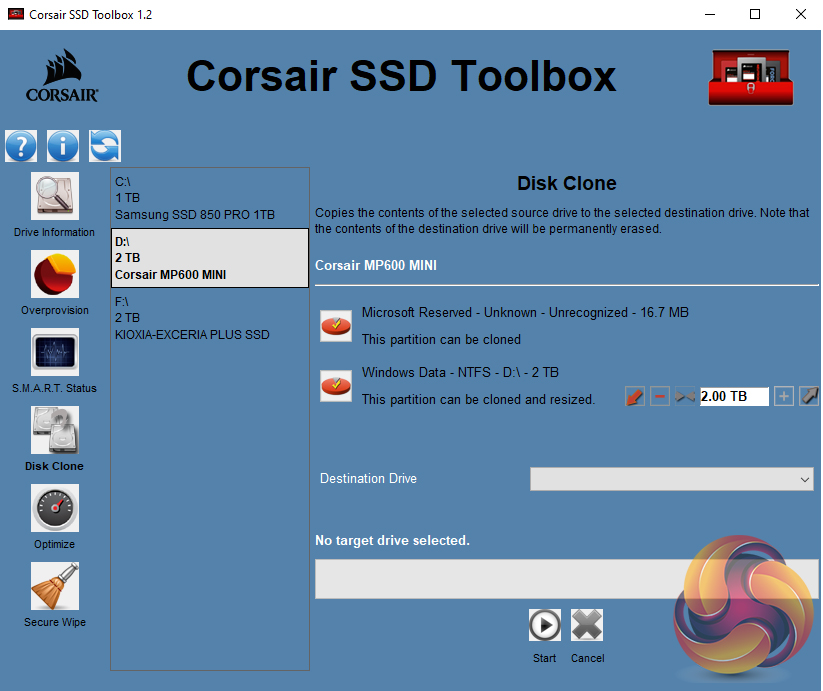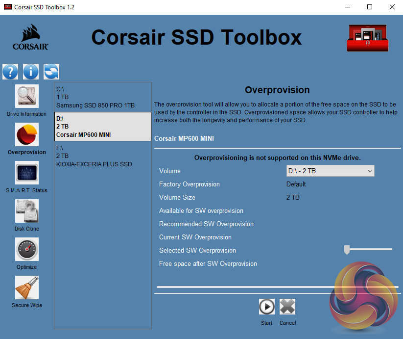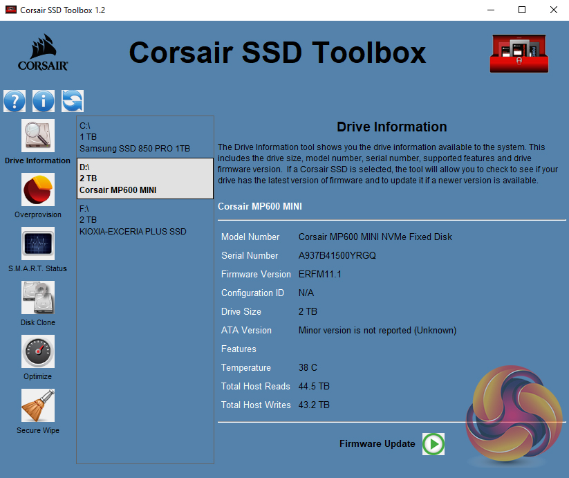 Corsair’s SSD management utility is called SSD Toolbox. It's not the funkiest-looking GUI we've ever seen but having said that, it does give all you really need to keep an eye on the drive. It provides drive information and S.M.A.R.T details and also supports firmware updates, secure wiping of the drive, drive optimisation and usefully incorporates a disk cloning utility.
