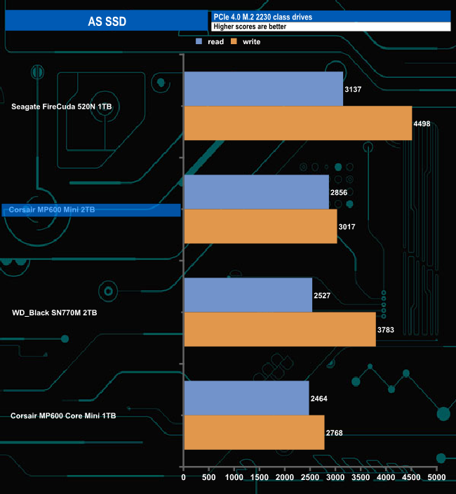 Using the AS SSD benchmark the drive's read score of 2856 sees the drive in second place on the results chart but its write score of 4498 is the fastest we've seen to date for a M.2 2230 drive.