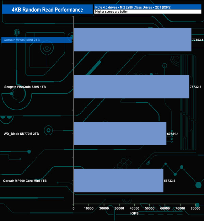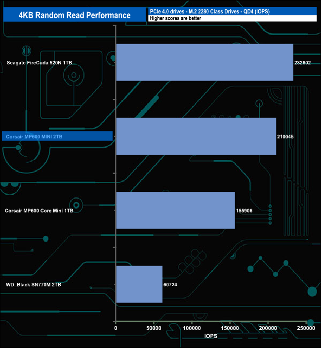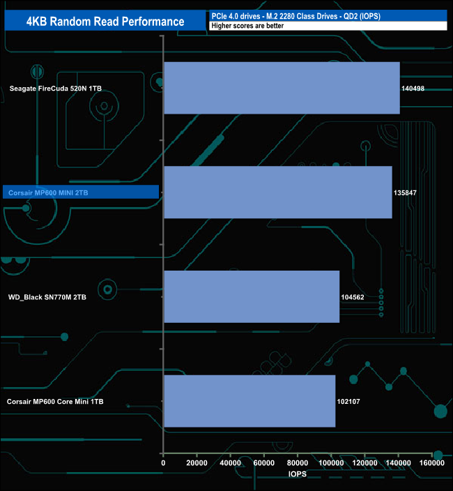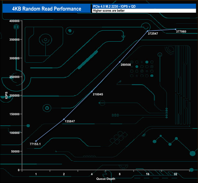 At QD 1 the drive is the fastest M.2 2230 drive we've seen to date but after that, it drops to second spot for all the remaining tested queue depths.