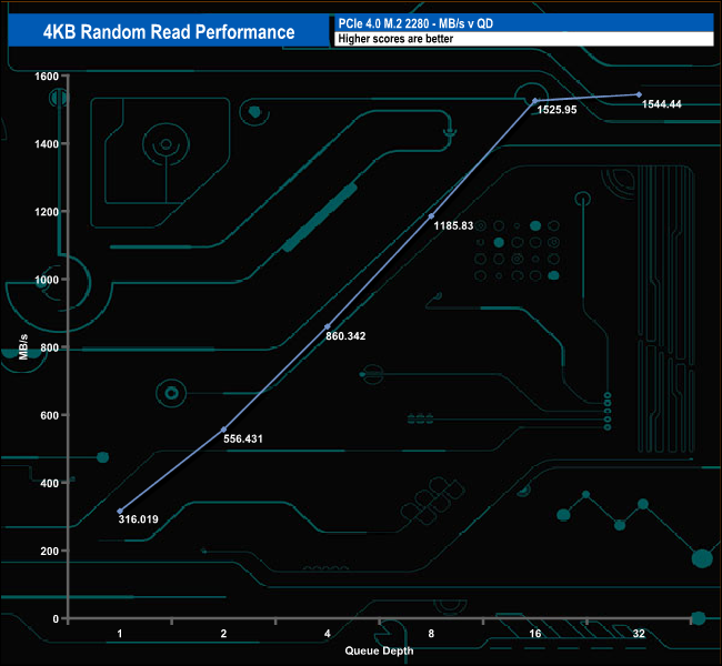We used CrystalDiskMark 8‘s custom settings to test the 4K random read performance of the drive through a range of queue depths. The setup for the tests is listed below.