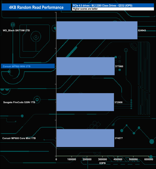 The 2TB MP600 Mini is officially rated as up to 750,000 IOPS for random reads. Using our 4-threaded random read test we couldn't get close to the official maximum as the best we saw was 377,060 IOPS (1,544.44MB/s) at QD32.