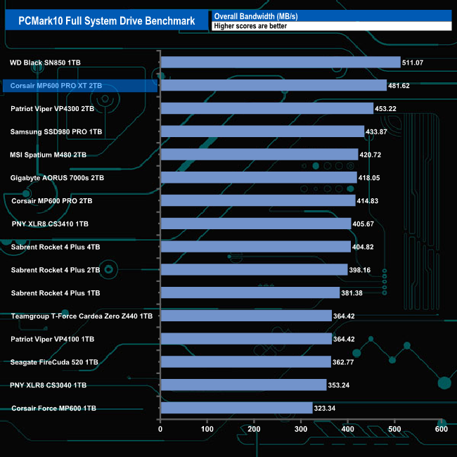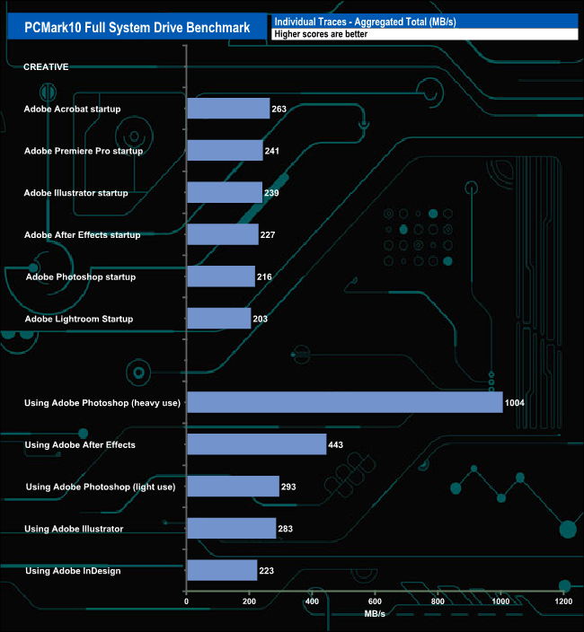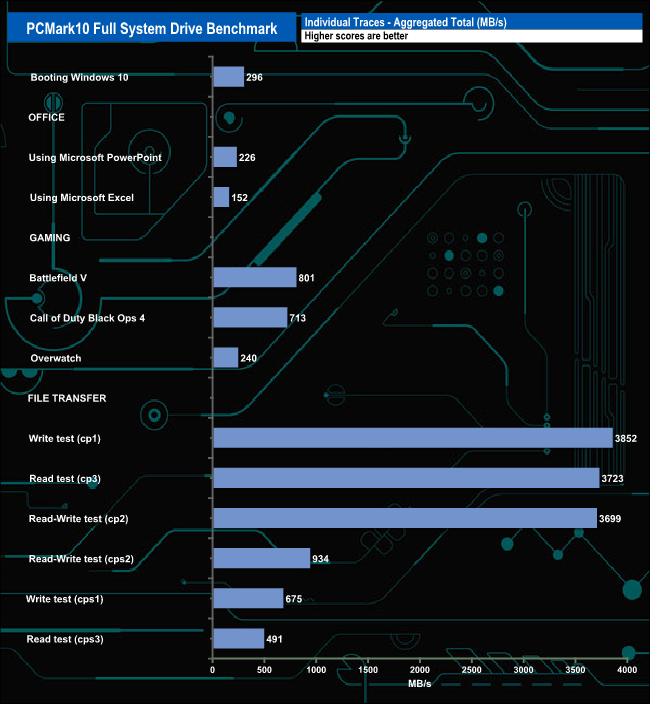 The PCMark 10 Full System Drive Benchmark uses a wide-ranging set of real-world traces from popular applications and common tasks to fully test the performance of the fastest modern drives. The benchmark is designed to measure the performance of fast system drives using the SATA bus at the low end and devices connected via PCI Express at the high end.
