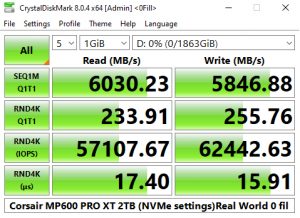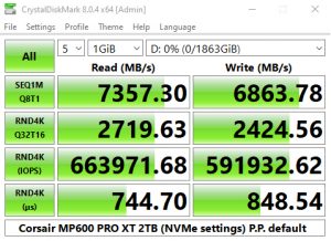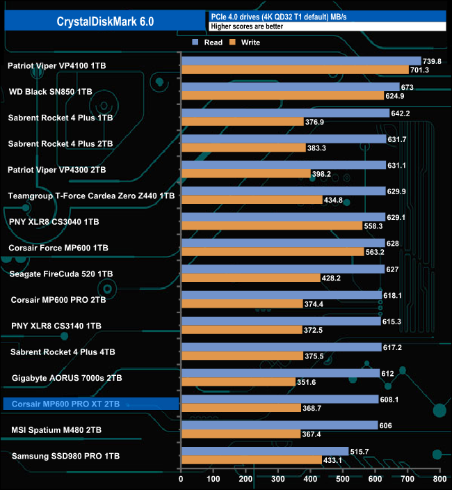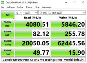 Looking at all the CrystalDiskMark results screens we can see that the Phison E18 controller that the MP600 Pro XT uses is much more efficient when reading compressible sequential and 4K data at certain queue depths.