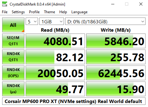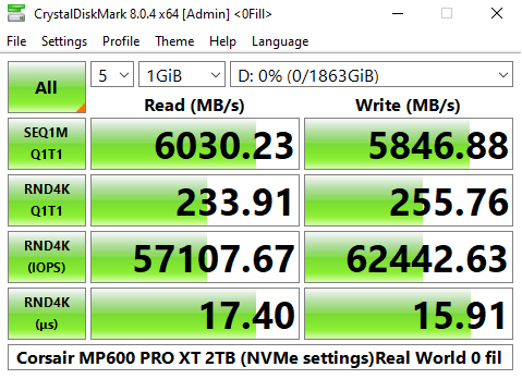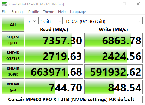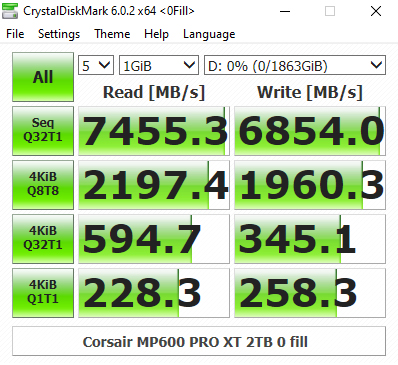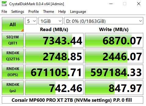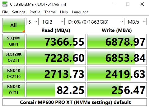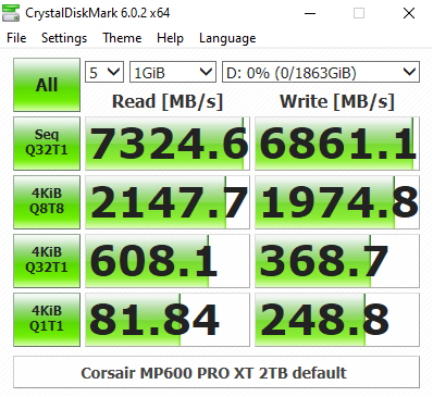 The Corsair MP600 Pro XT didn't seem to handle the QD32 T1 CrystalDiskMark test that well, the tested figures being slightly lower than the previous Corsair MP600 Pro. However, we could confirm the official Sequential performance figures of up to 7,100MB/s and 6,800MB/s for reads and writes respectively with best test result figures of 7.324.6MB/s for reads and 6,861.1MB/s for writes, using the benchmark at default settings.