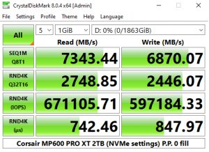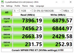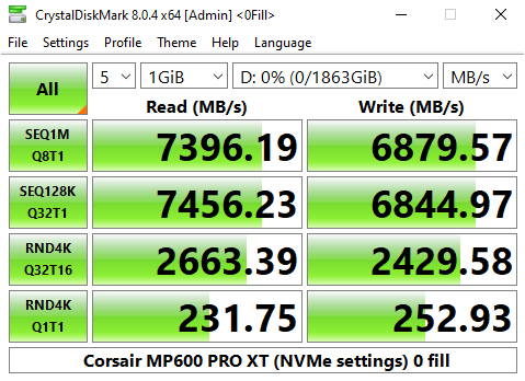Using CrystalDiskMark 8 we again confirm the official Sequential figures with the best test results of 7,396.19MB/s for reads and 6,879.57MB/s for writes.