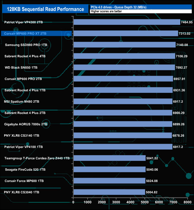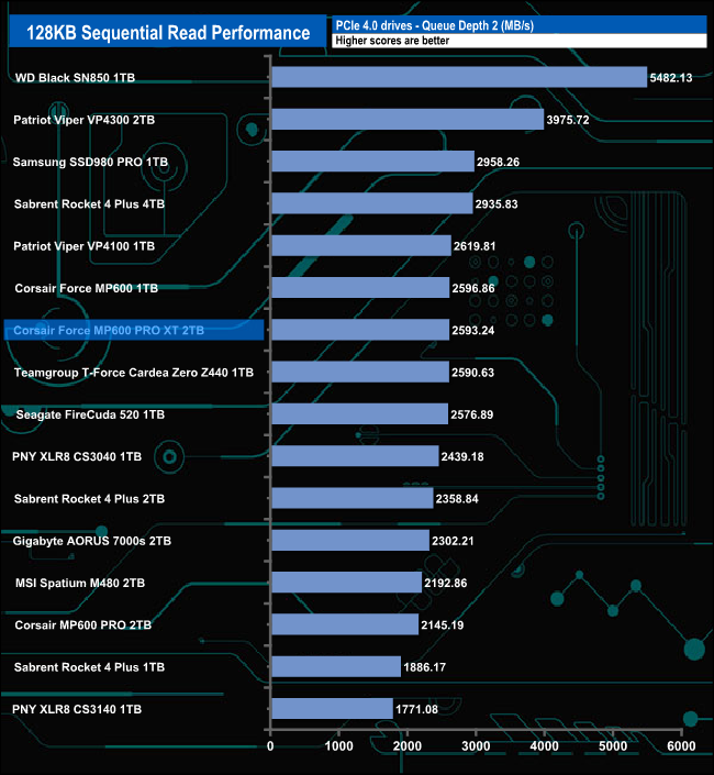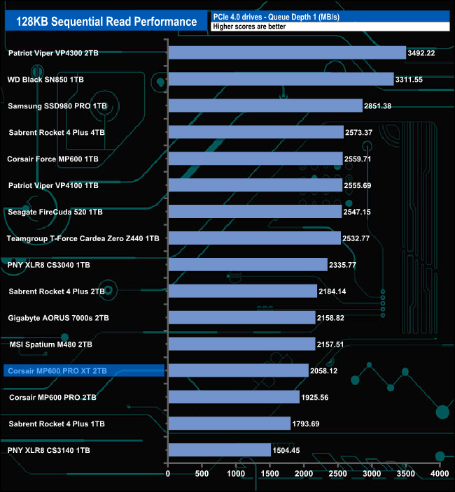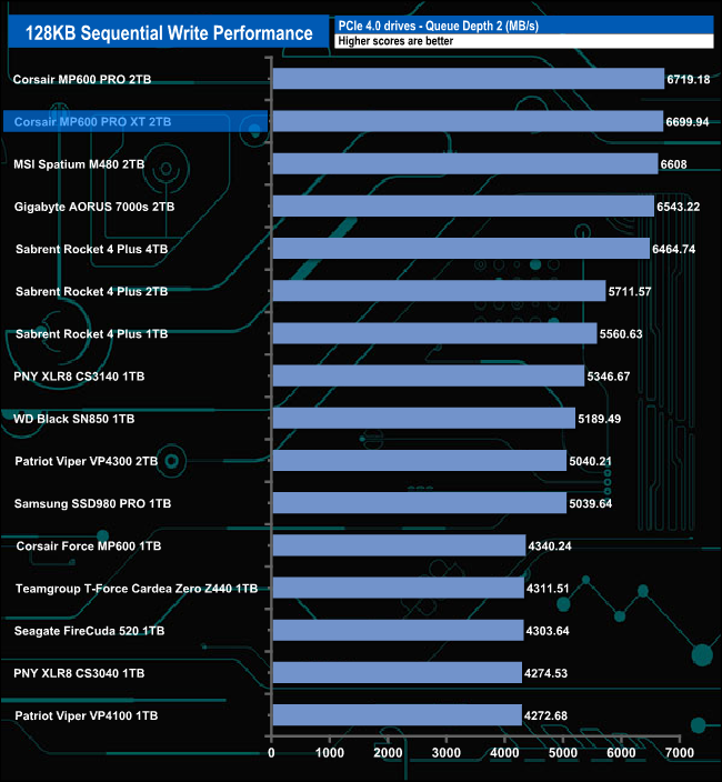 Although the drive's performance at QD 1 isn't going to ruffle any feathers, it is still 133MB/s faster than the previous Corsair MP600 Pro drive. However at deeper queue depths, the drive's performance improves dramatically so by QD32, only Patriot's Viper VP4300 drive is faster.