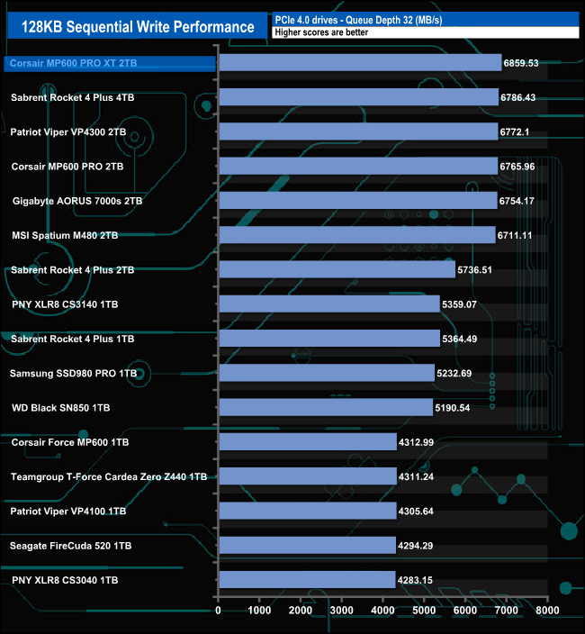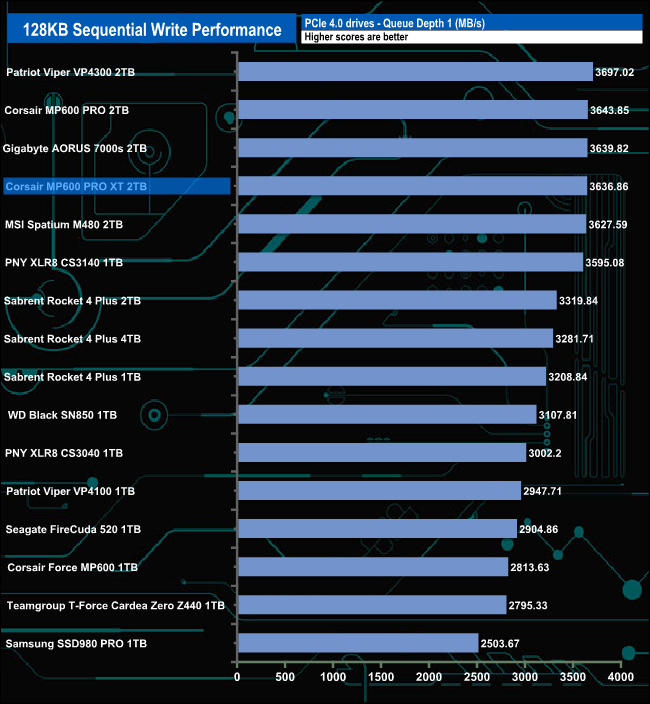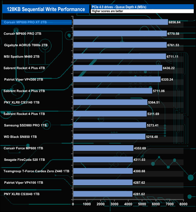 In contrast to the Sequential read performance, the Sequential write performance of the drive is impressive from the start. At the tested queue depths of 4 & 32, the Corsair MP600 Pro XT is the fastest consumer Gen 4 drive we've tested to date.