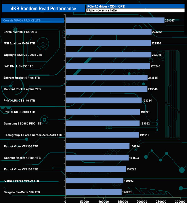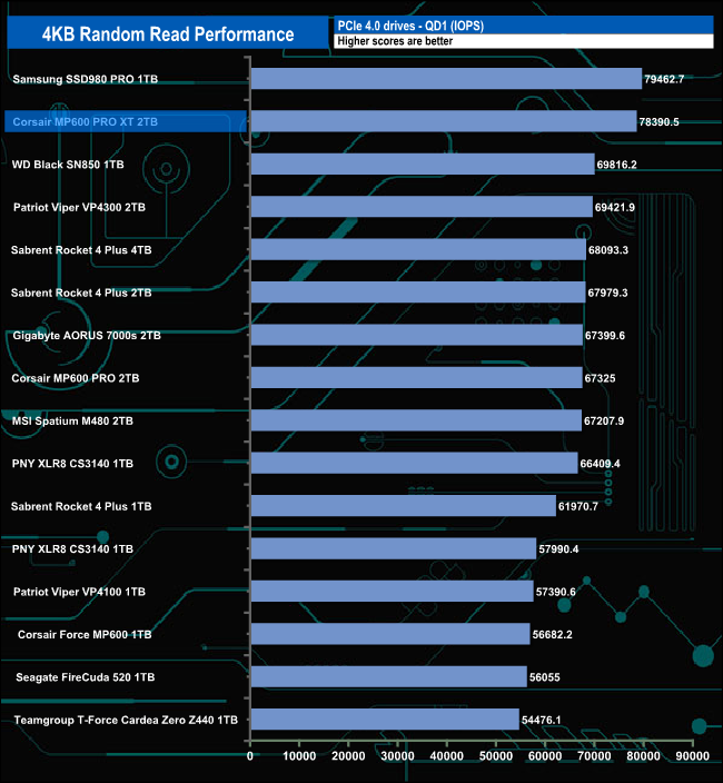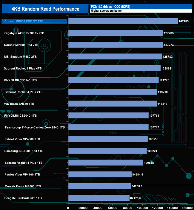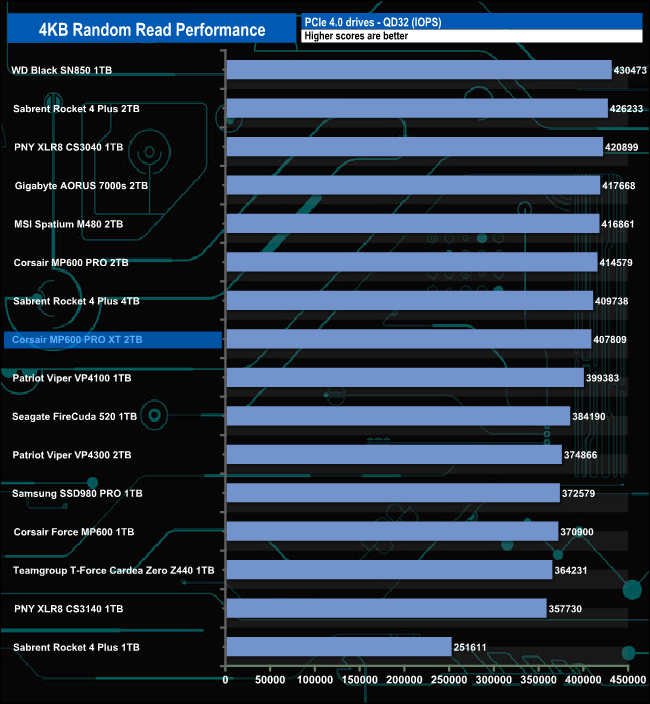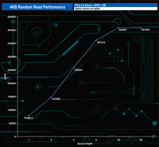 While our tested 4K read results are nowhere near the official maximum, at QD1. the drive is the second-fastest drive we've seen to date and at QD's 2 & 4, the drive has the fastest random read performance we've seen so far for a consumer drive. However, by the time the drive reaches QD32, it has started to drop down the results chart.