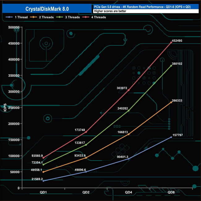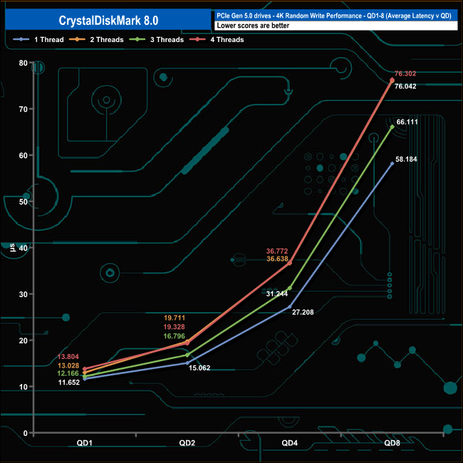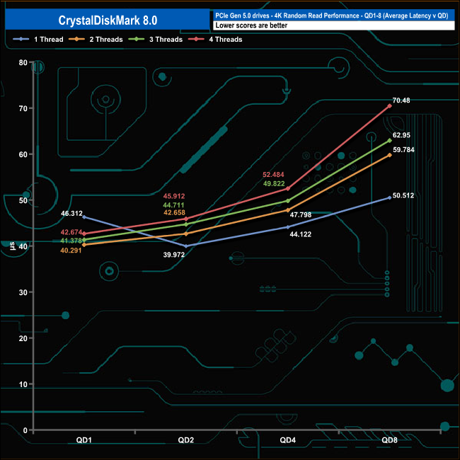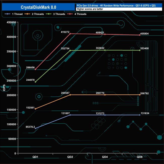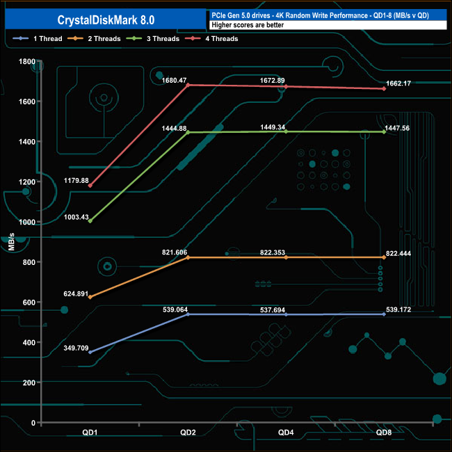 We used CrystalDiskMark 8 to test the random performance of the drive at lower queue depths (QD1 –QD8 where most of the everyday workloads occur) using 1 to 4 threads.