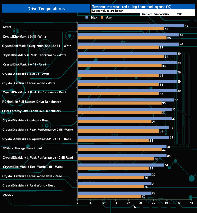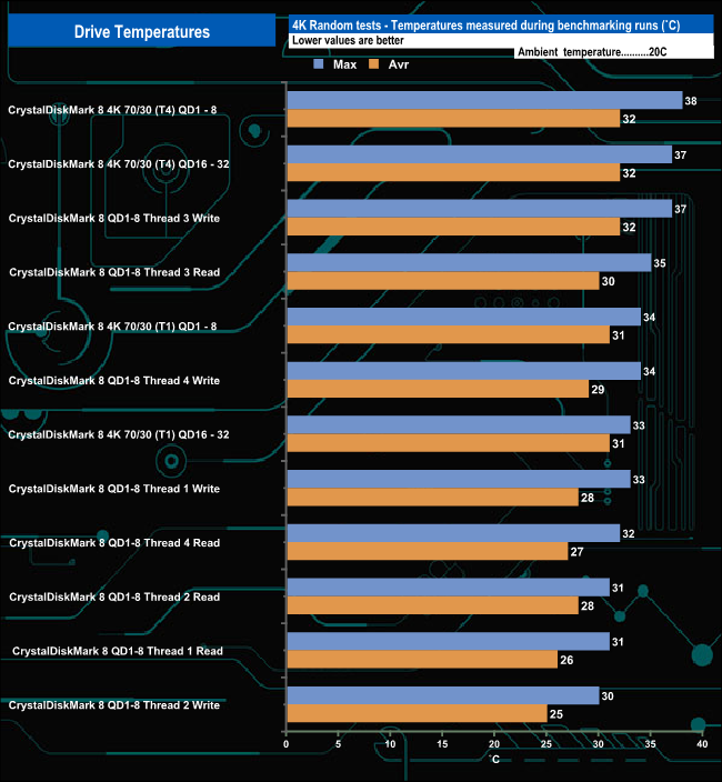 Under benchmarking the hottest the drive got was 42°C when the drive was running the ATTO benchmark which is 28°C off the maximum operating temperature of 70°C. For the majority of the testing, the drive averaged 36.4°C which for a Gen5 drive is very impressive while the 4 K-based tests averaged out at 33°C, another impressive figure.