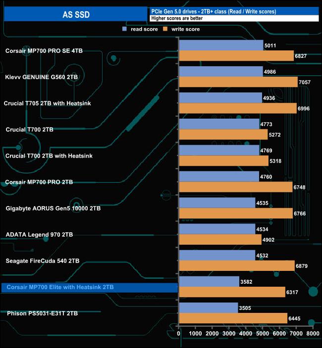 The Corsair MP700 Elite with Heatsink sits just above the reference Phison E31T with its read score of 3582 however, the reference design has a better write score.