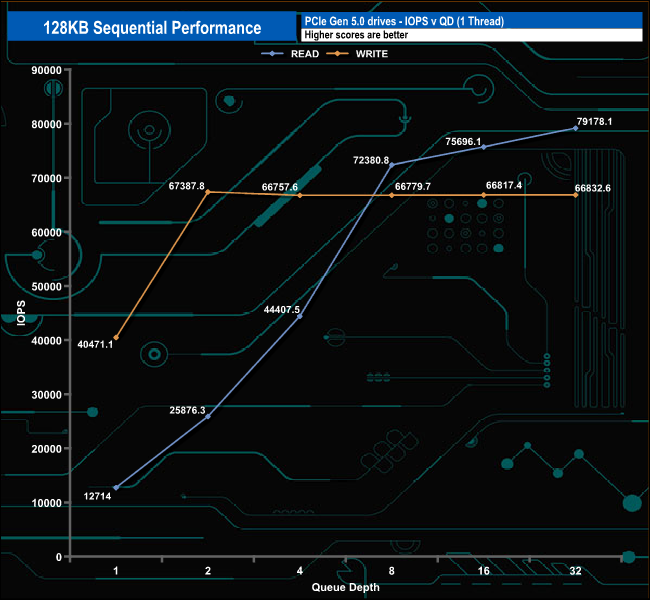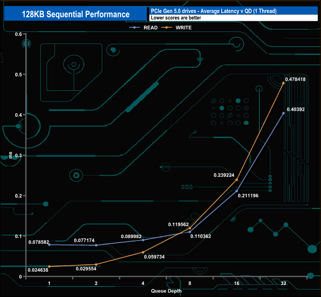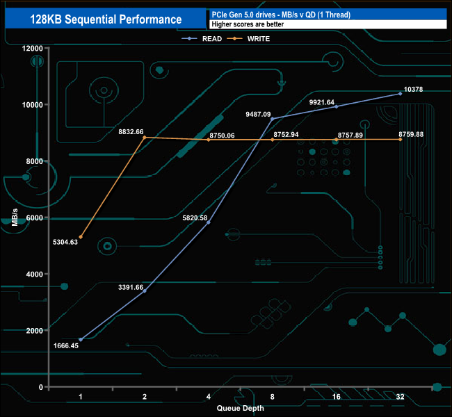 We used CrystalDiskMark 8‘s custom settings to test the sequential read and write performance of the drive through a range of queue depths. The setup for the tests is listed below.