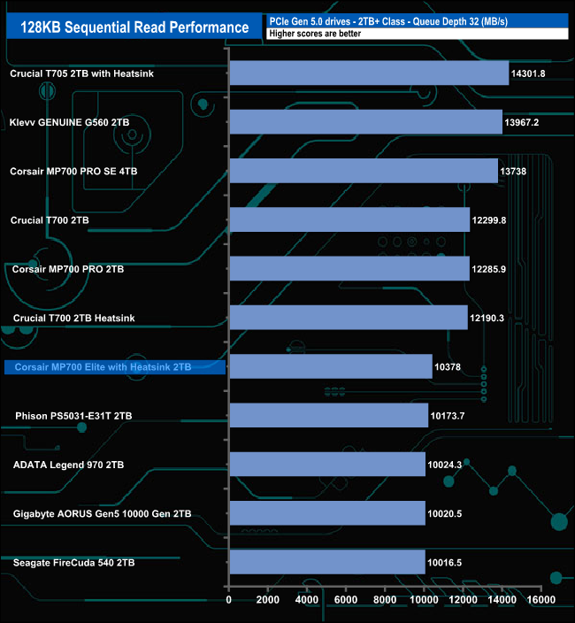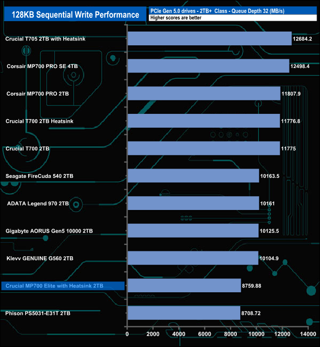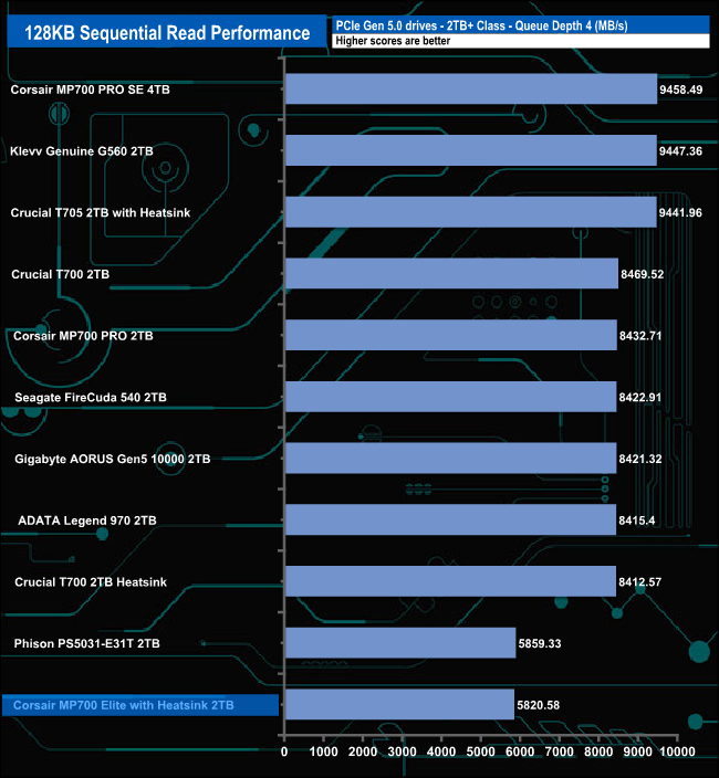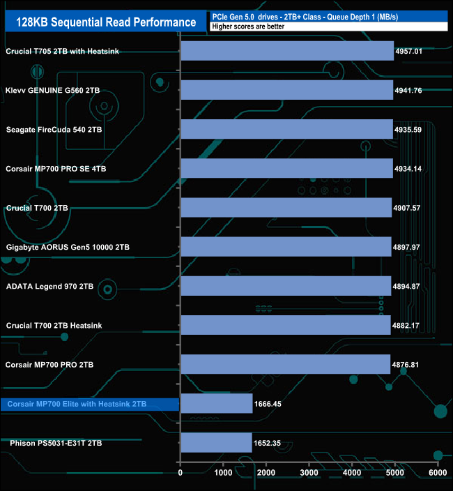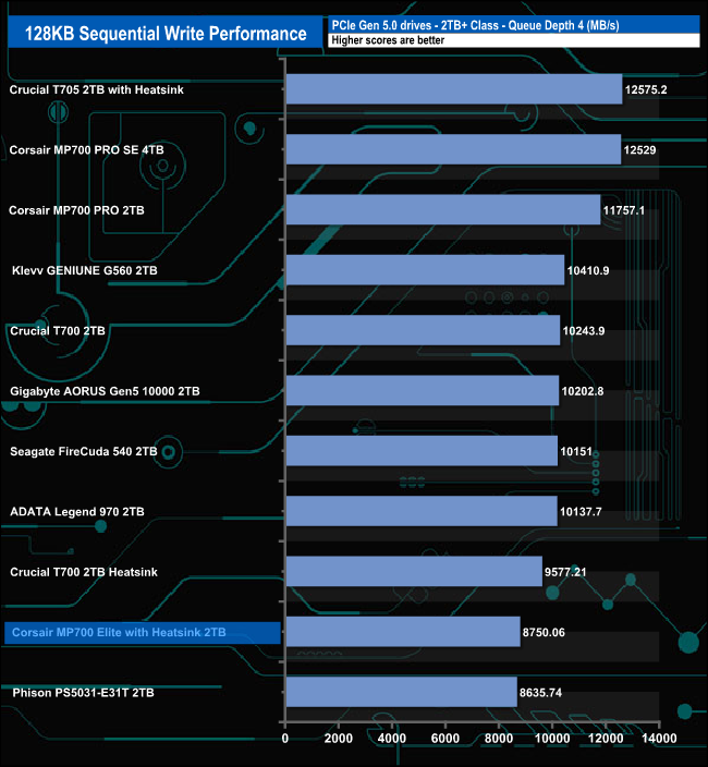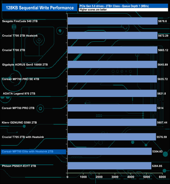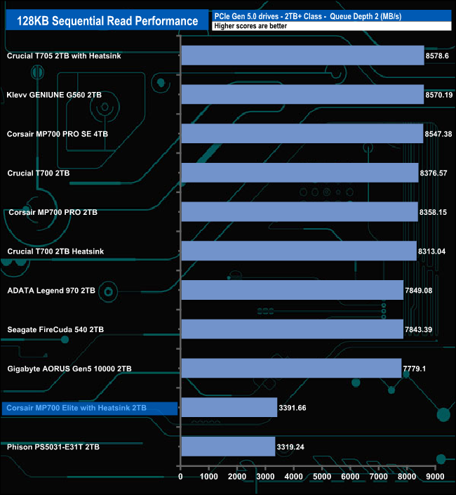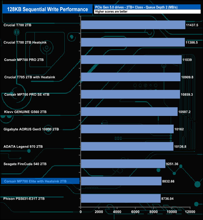When it comes to the sequential write test results the MP700 Elite with Heatsink sits just above the PS5031-E31T reference design through all the tested queue depths.