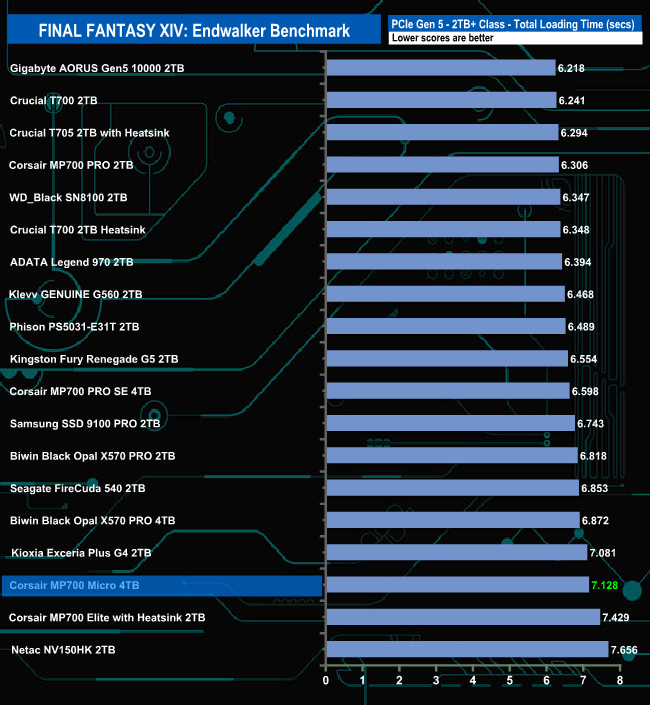 Overall, the 4TB Corsair MP700 Micro sits third from bottom in the results chart. It performs best in Load Scene 1, where it just sits outside the top ten.