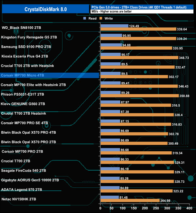 Corsair's 4TB MP700 Micro performs well in the CrystalDiskMark 8 4K QD1 T1 test; its read score of 89.5MB/s puts it into sixth place in the results chart, although its write score of 302.17MB/s isn't as strong as its immediate competitors around it in the chart.