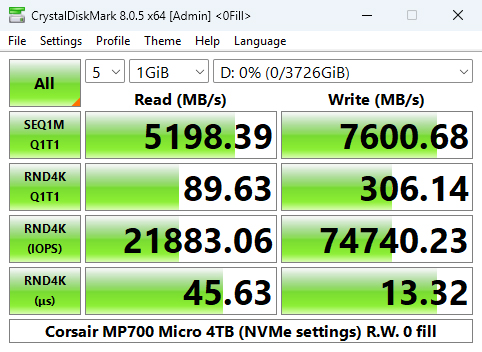 The Corsair MP700 Micro sits in last place in the CrystalDiskMark 8 Real World result table with a read score of 5,194MB/s, but its write result of 7,598MB/s is much stronger.