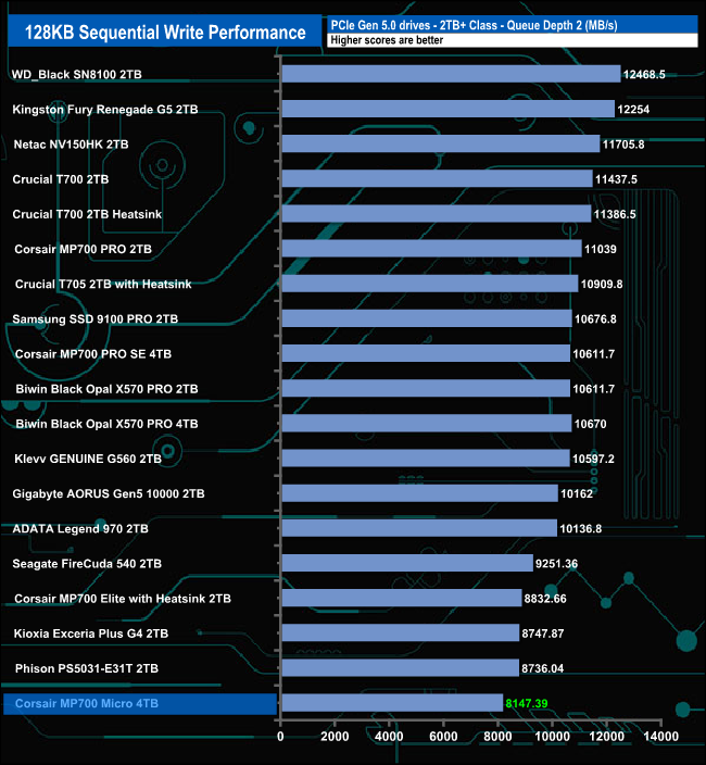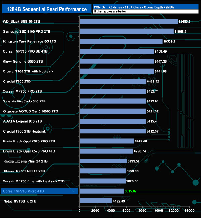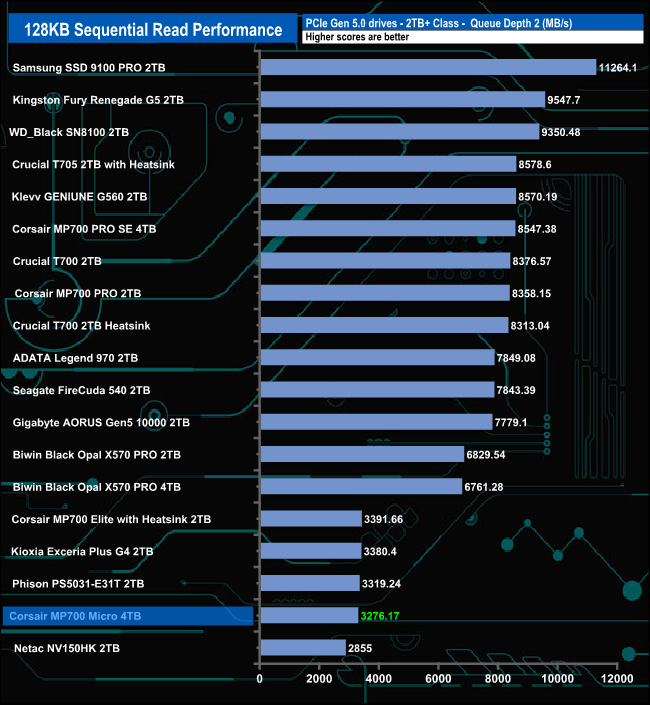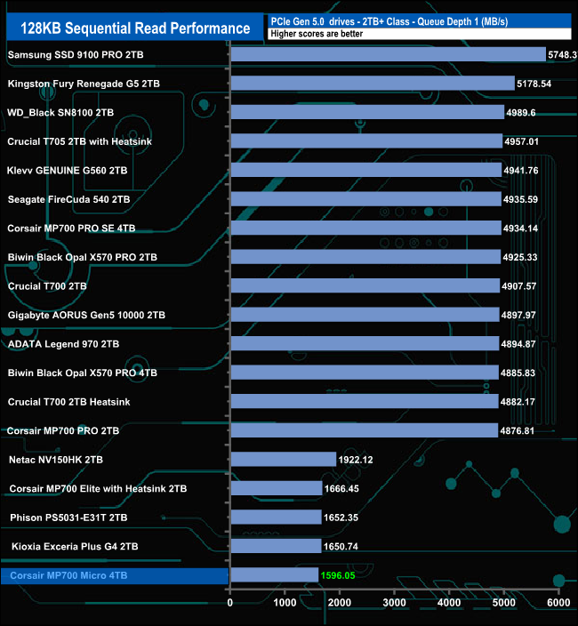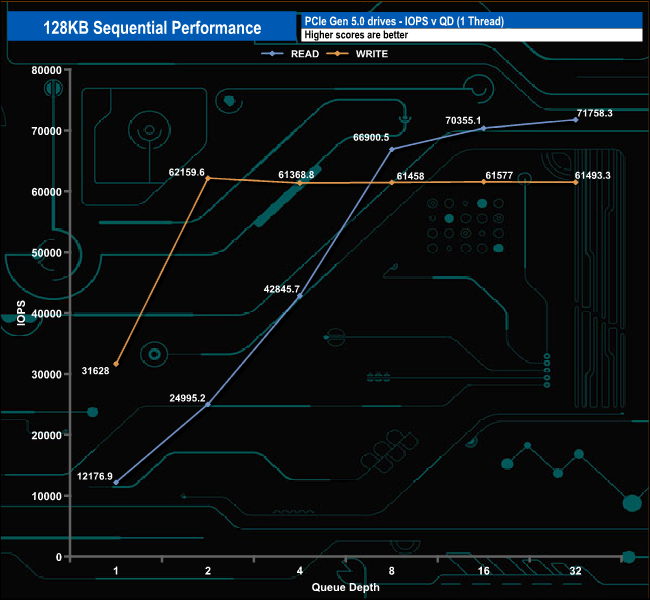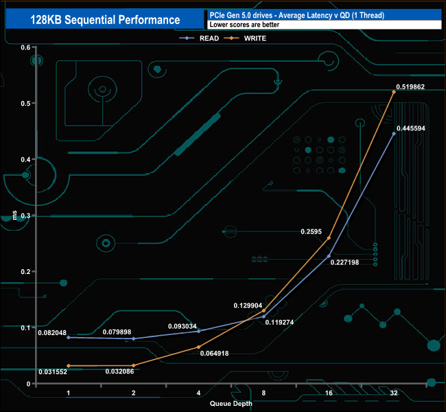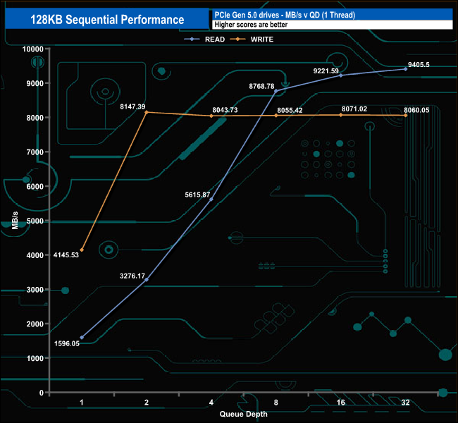 We used CrystalDiskMark 8‘s custom settings to test the Sequential read and write performance of the drive through a range of queue depths. The setup for the tests is listed below.