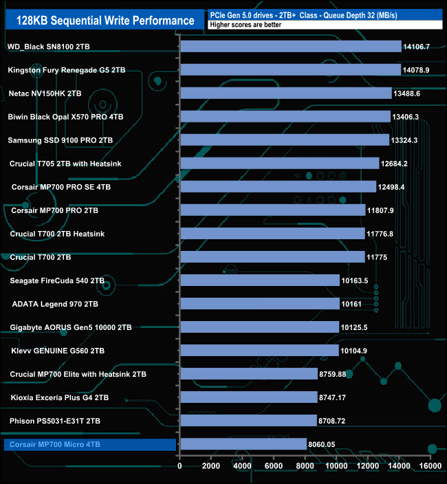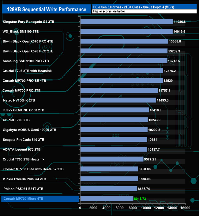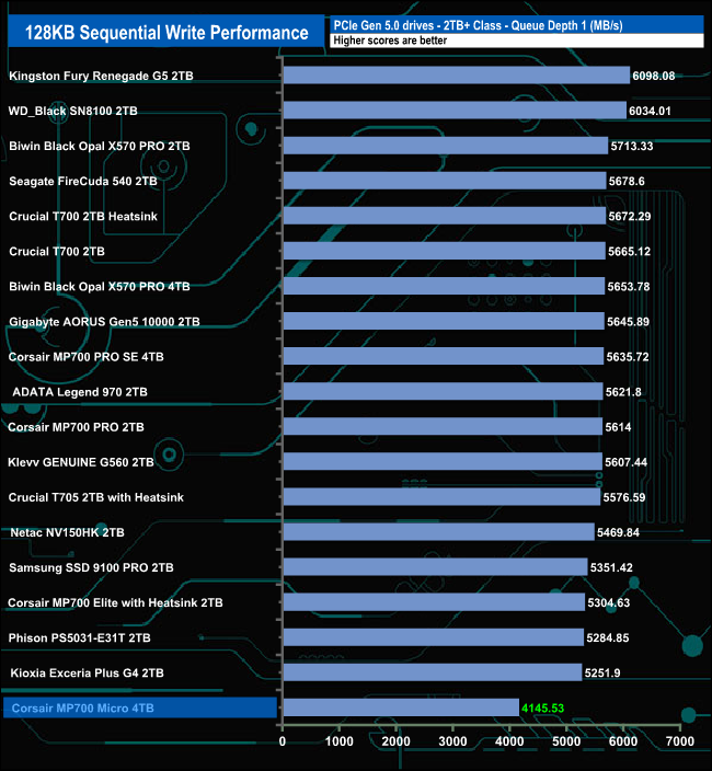 When it comes to Sequential write performance, the drive props up the table at every tested queue depth. It's closest to the next drive in the table at QD2.