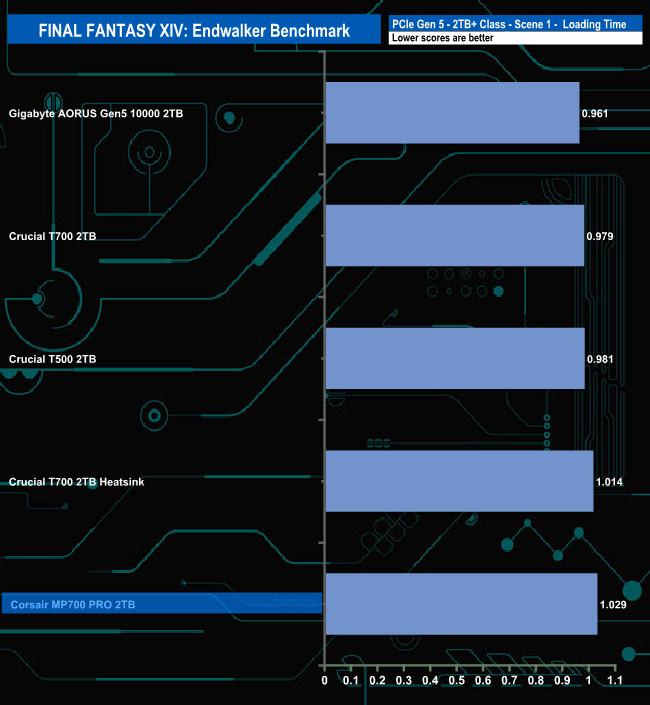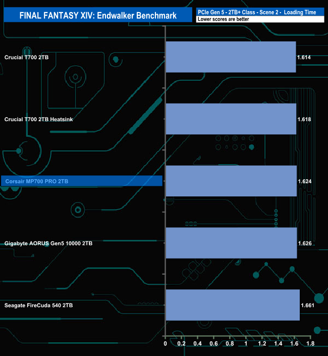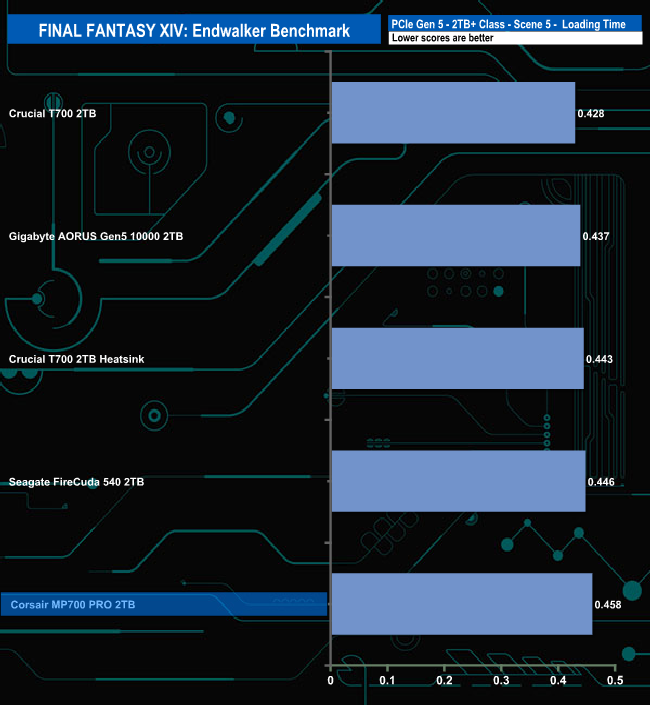 The Corsair MP700 PRO does pretty well in the Final Fantasy XIV Endwalker Official Benchmark. It doesn't top any of the load results charts and even sits bottom of the Scene 1 and Scene 5 charts but still manages to end up in third place overall for the complete benchmark run.