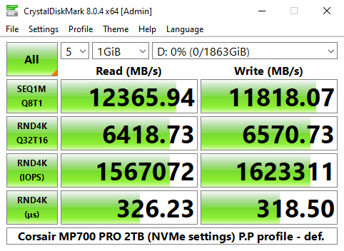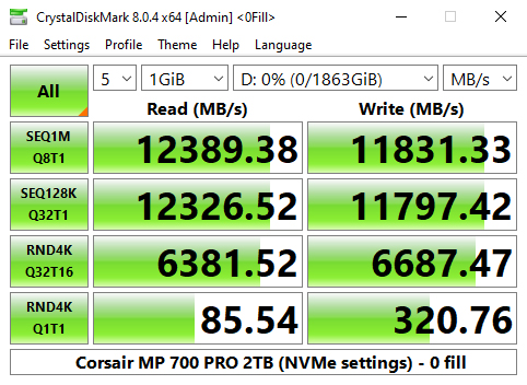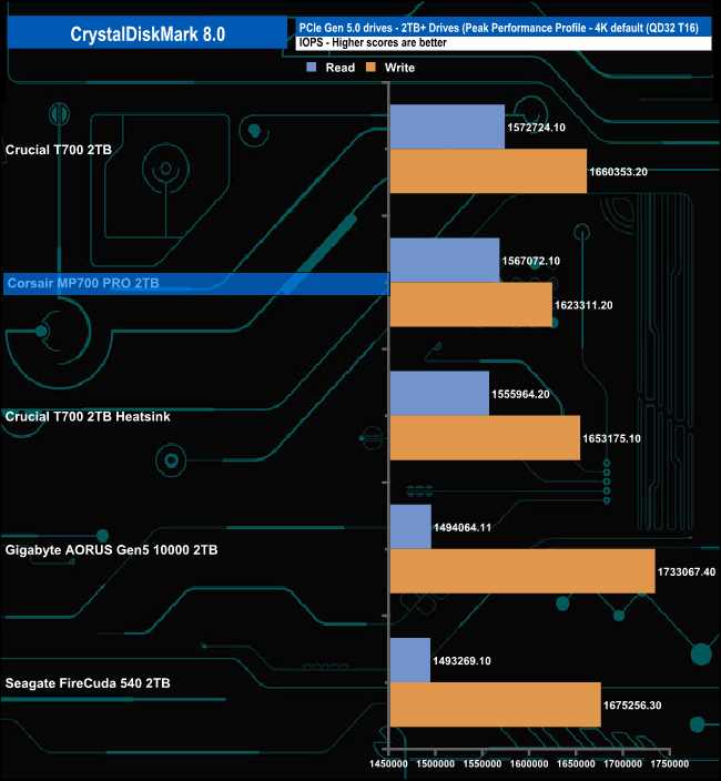In CrystalDiskMark 8's 4K QD1 T1 test, the Corsair MP700 PRO splits the two versions of Crucial's T700 drive. It has a slightly faster read speed than the plain T700 but has a little slower write speed than both the Crucial drives.