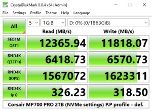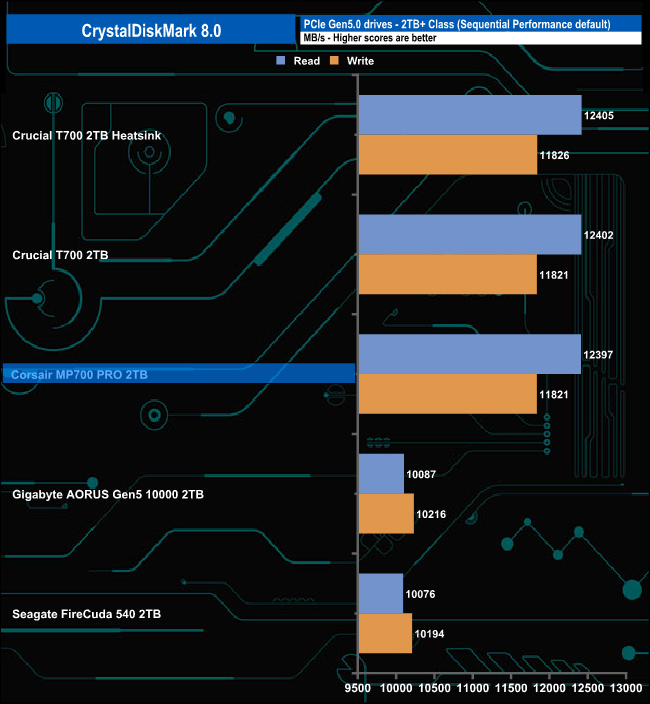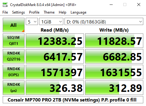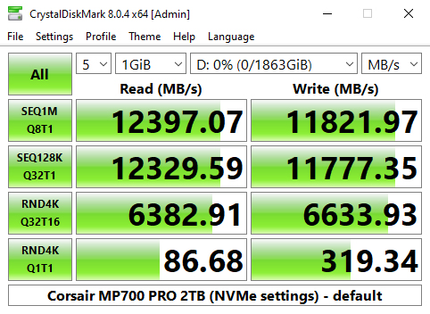 As you can see from the benchmark result screens we can confirm the official Sequential read/write figures for the 2TB MP700 PRO of 12,400MB/s and 11,800MB/s respectively, with a best test read result of 12,397MB/s with writes at 11,821MB/s.