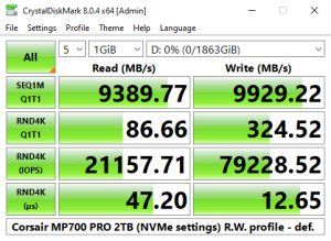 Corsair's MP700 PRO sits in third place in the Real World Profile chart with Sequential read/write scores of 9.389MB/s and 9,929MB/s respectively.