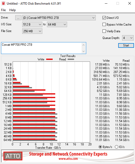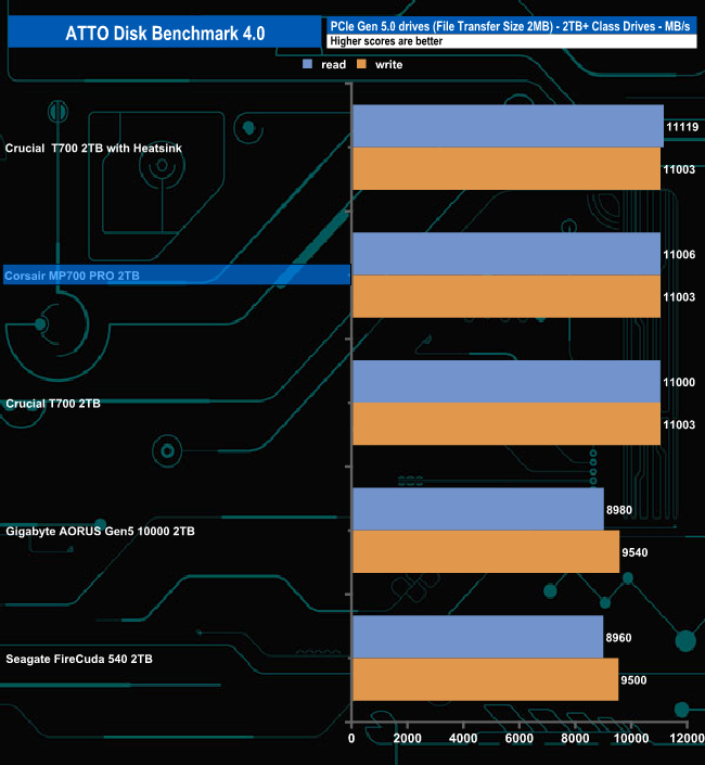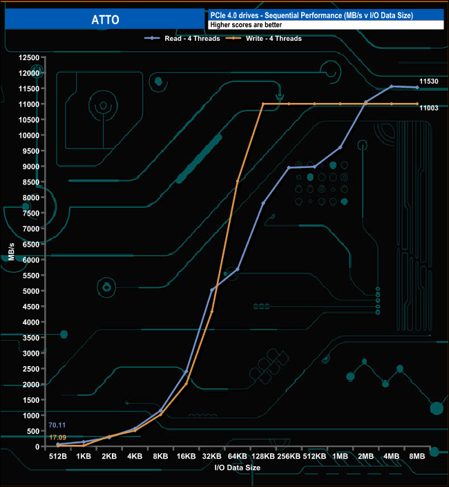 Using the ATTO benchmark we couldn't quite get to the official maximum Sequential figures of up to 12,400MB/s and 11,800MB/s for reads and writes respectively for the MP700 PRO. The best we saw from the drive under testing was 11,006MB/s for reads and 11,003MB/s for writes.