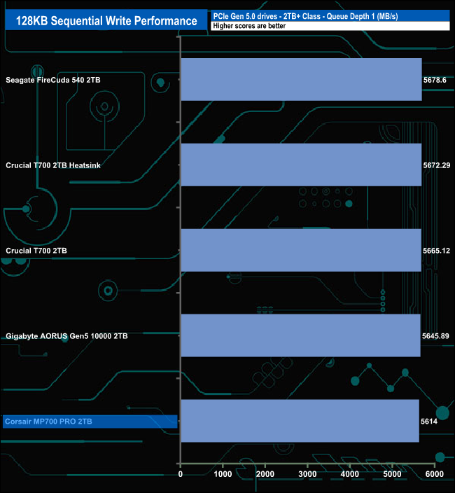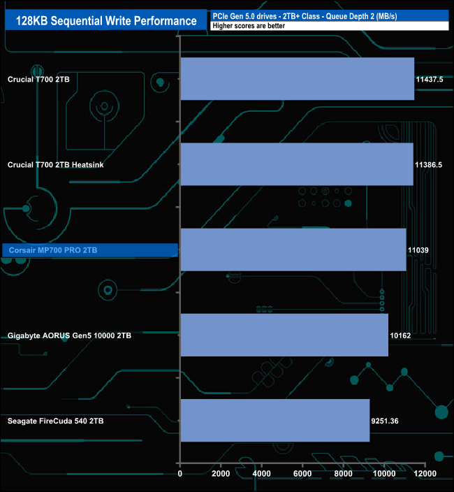 At QD1, the Corsair MP700 PRO sits at the bottom of the table for Sequential reads by a tiny margin. However, by QD2 and beyond it has moved into second place behind the standard version of Crucial's T700 drive.