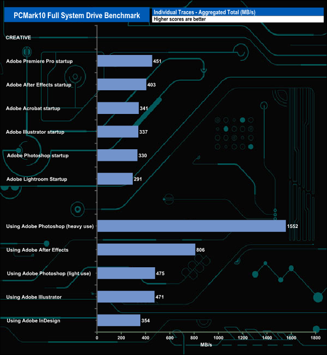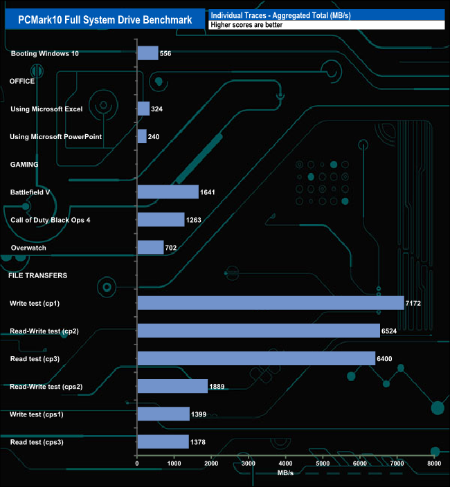 The PCMark 10 Full System Drive Benchmark uses a wide-ranging set of real-world traces from popular applications and common tasks to fully test the performance of the fastest modern drives. The benchmark is designed to measure performance of fast system drives using the SATA bus at the low end and devices connected via PCI Express at the high end.