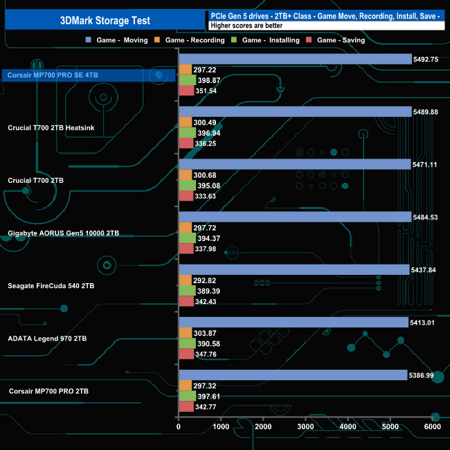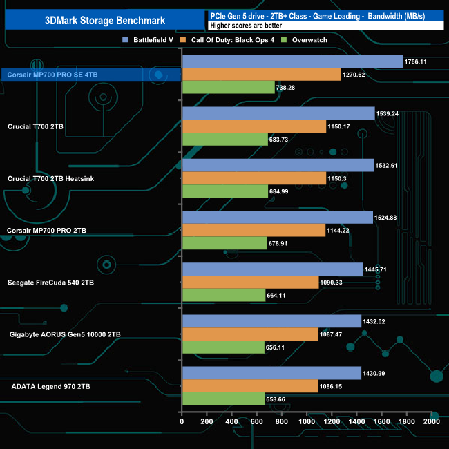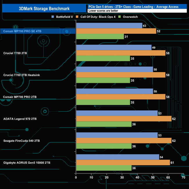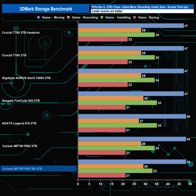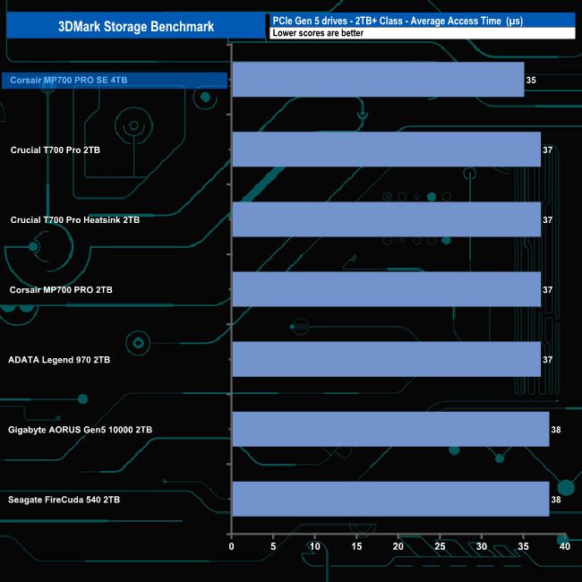 In 3DMark’s Storage Test, the 4TB Corsair MP700 PRO SE sits on the top of the table with an average game loading bandwidth figure for the three games of 1,258MB/s with an average access time of 42µs.