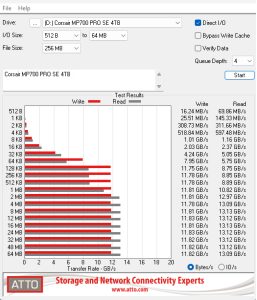 Using the ATTO benchmark, the MP700 PRO SE write performance peaked at the 1MB mark at 11,810MB/s and plateaued around that point for the rest of the test up to an I/O size of 8MB. The read performance started to plateau at the 128KB mark but after 512KB it began to rocket upwards to its peak at the 8MB mark at 13,130MB/s.