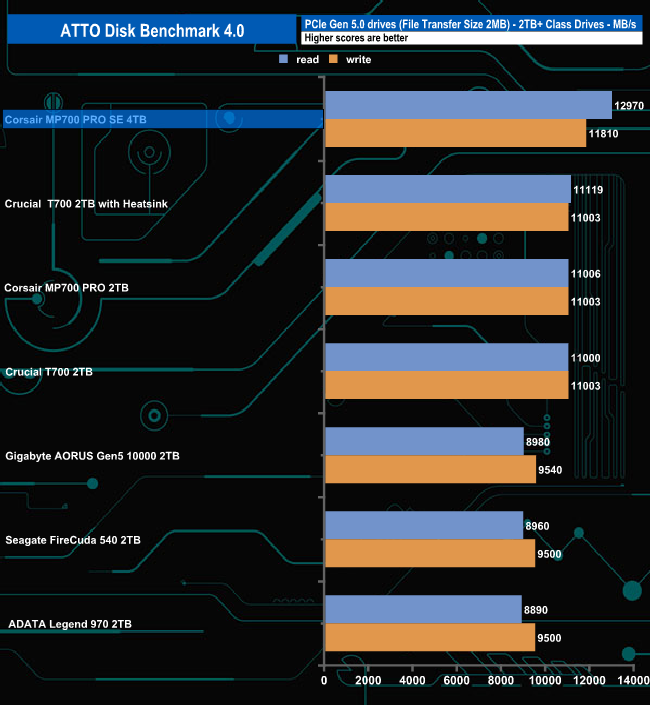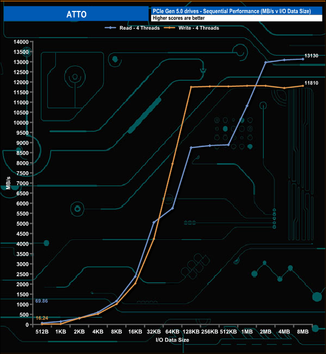 Using the ATTO benchmark we couldn't quite get to the official maximum Sequential figures of up to 14,000MB/s and 12,000MB/s for reads and writes respectively for the MP700 PRO SE. The best we saw from the drive under testing was 12,970MB/s for reads and 11,810MB/s for writes. Although not as fast as the official maximums, those scores are the highest we've seen from a Gen 5 drive to date.