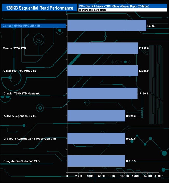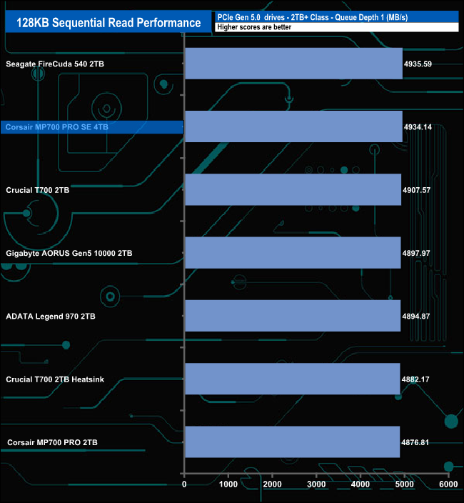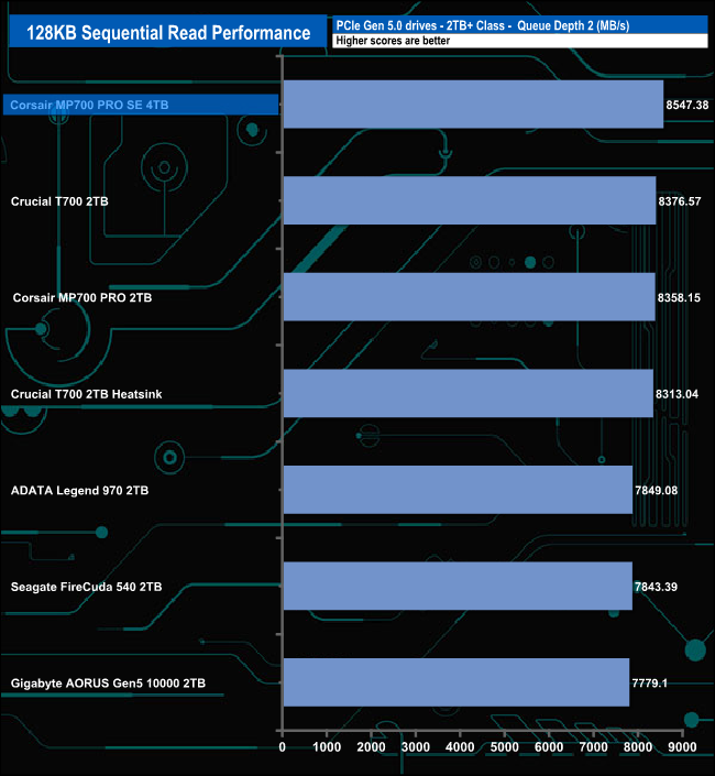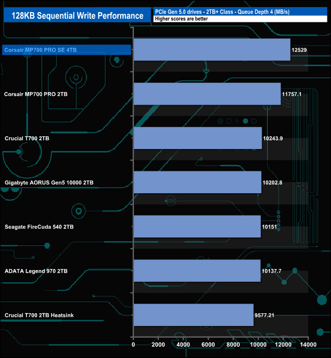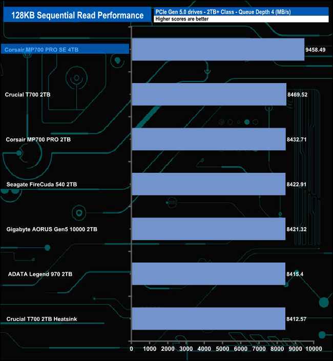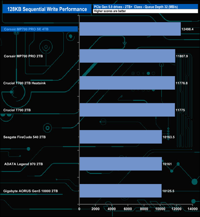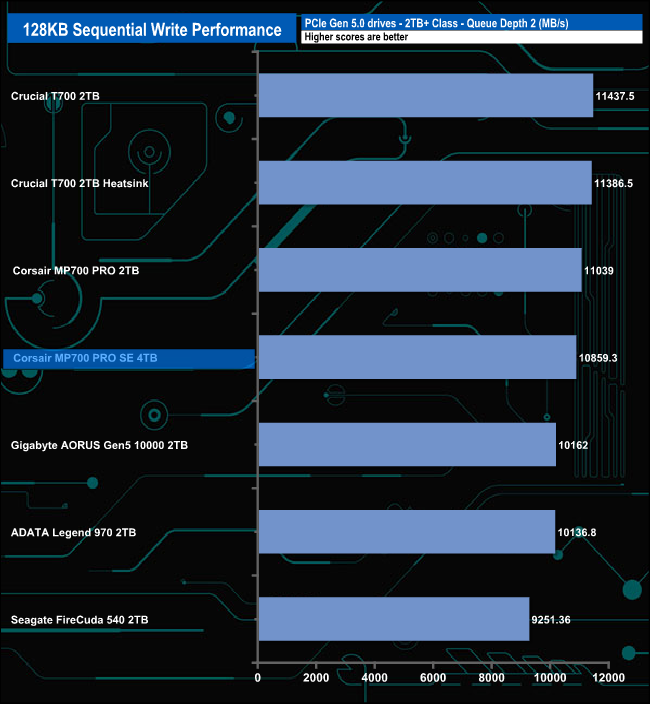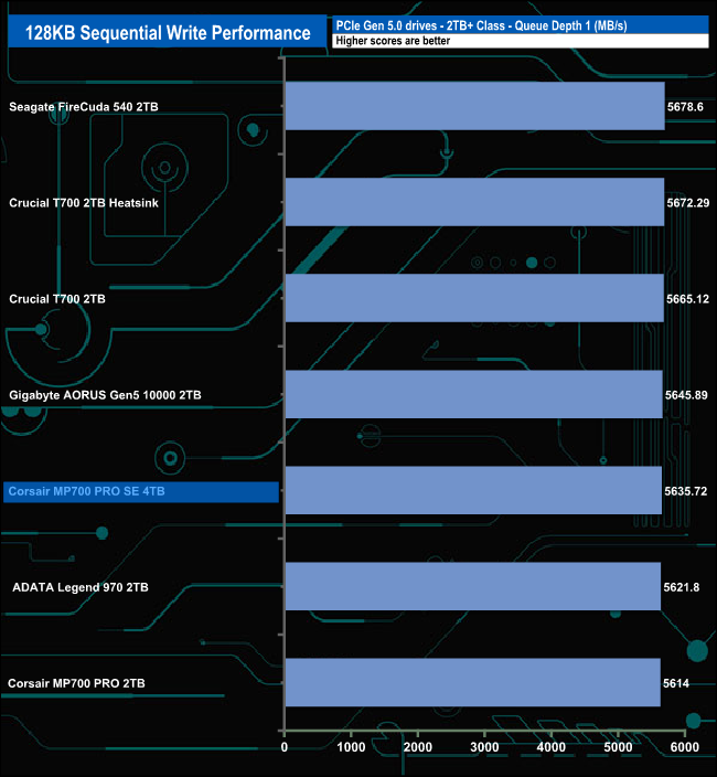 At QD1, the Corsair MP700 PRO SE sits in second place behind Seagate's FireCuda 540 by a very tiny margin. After that the Corsair drive pulls away from the rest of the drives so by QD32 it leads the nearest drive, the Crucial T700, by 1,438MB/s.
