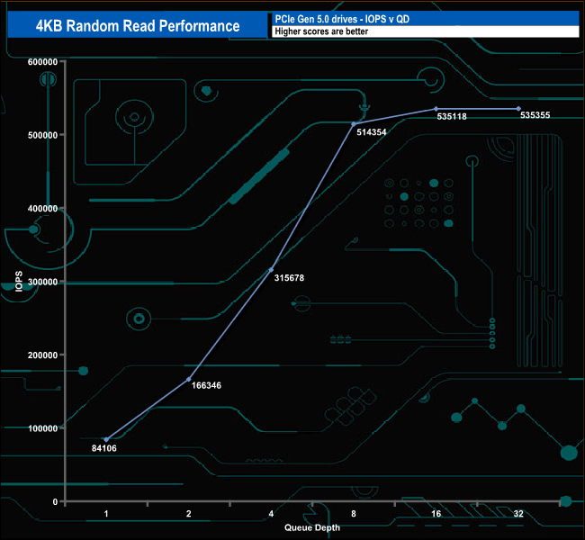 Using our four-threaded 4K random read tests, we couldn't get close to the official maximum of 1,700K IOPS. The best figure we saw was 535,355 IOPS (2,192MB/s) at the end of the test run at QD32.