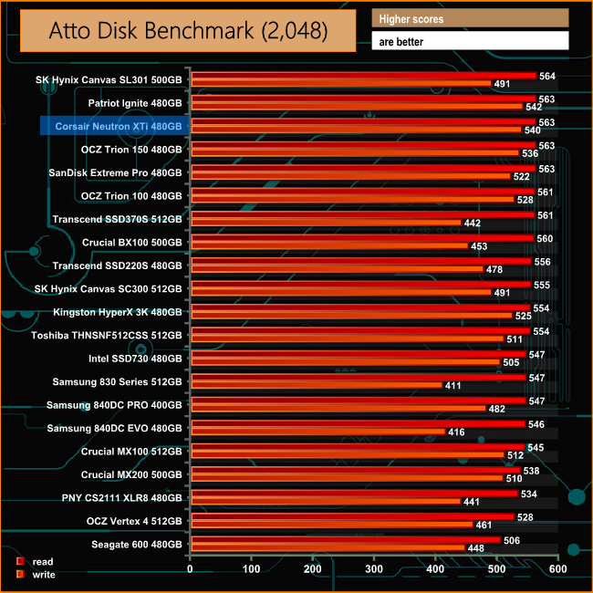 Corsair quote sequential read/write figures for the Neutron XTi 480GB at up to 560MB/s and 540MB/s respectively which are confirmed by the ATTO benchmark, putting the drive firmly into the top 5 fastest 480-512GB 2.5in class drives we've tested to date.