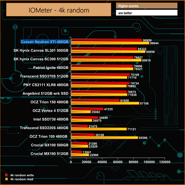 Corsair quote 4K random performance for the drive at up 100,000 IOPS for reads and up 90,000 IOPS for writes which once again are confirmed by a benchmark in this case, IOmeter. Once again it shows just how strong a performer the Neutron XTi is.