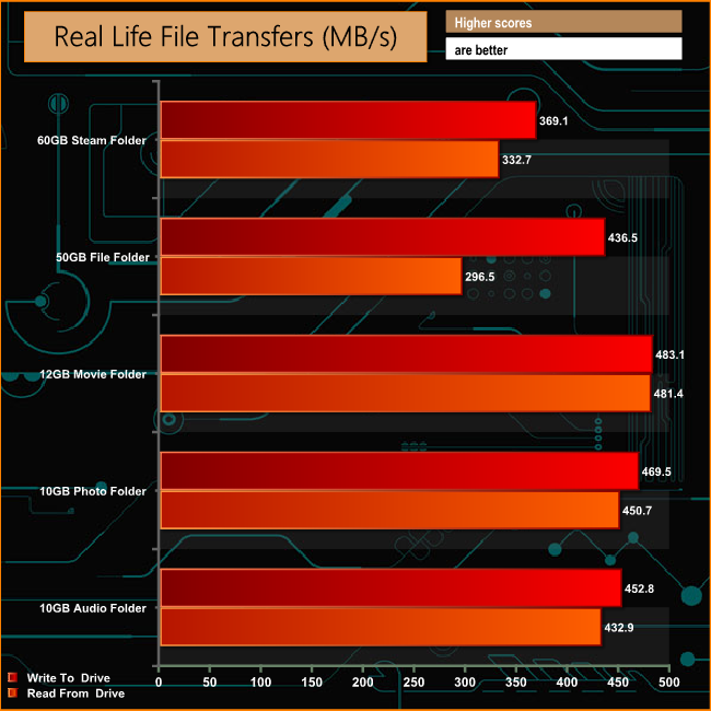 The drive seems to handle large file sizes much better than small bity files particularly when it comes to reading them. This can be seen with the read figures for both the 50GB file and the 60GB Steam folder as compared to the larger media file transfers.