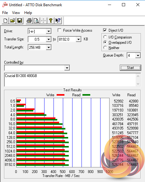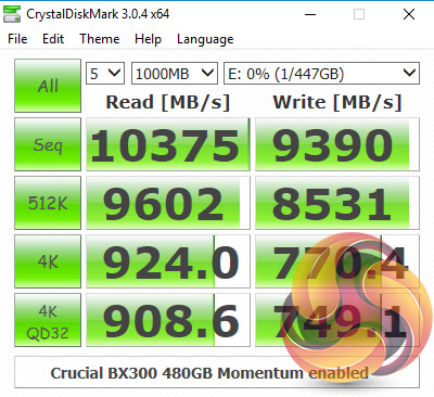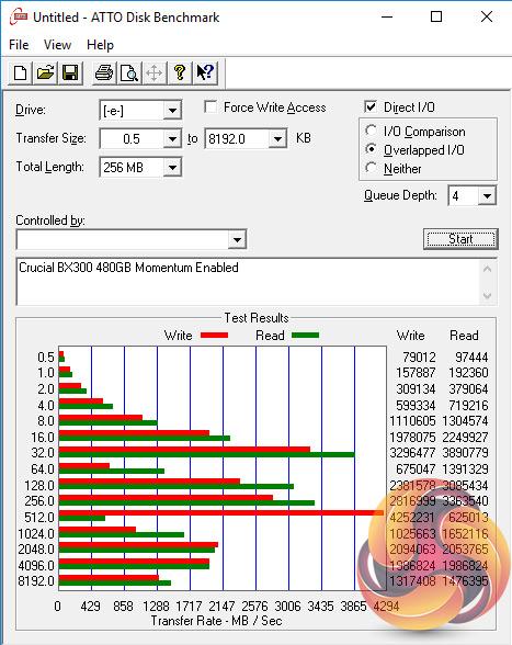 The Sequential read/write performance of the drive when the Momentum technology is applied is stunning with reads jumping from 564MB/s to 2053MB/s and writes rocketing from 526MB/s to 2094MB/s. However, as the ATTO results show, there is high degree of fluctuation in the drive’s performance in the test with the technology enabled.