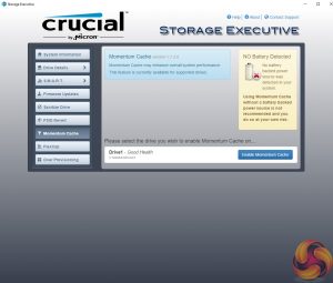 Crucial’s Momentum Cache technology is an intelligent software driver that dynamically leverages unused system memory to enhance burst performance and to overcome the fact that SSDs typically have better read performance that write. Momentum Cache will use up to 25% of available system memory, though no more than 4GB.