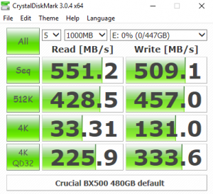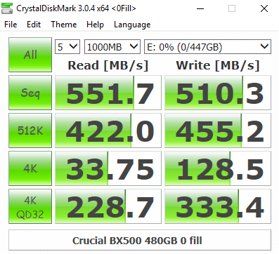 Crucial's BX500 is not the fastest when it comes to handling small bity files at a deepish queue depths although having said that the write performance is better than the read. Looking at the result screens it seems the Silicon Motion SM2258XT controller doesn't have a preference on what type of data it is handling
