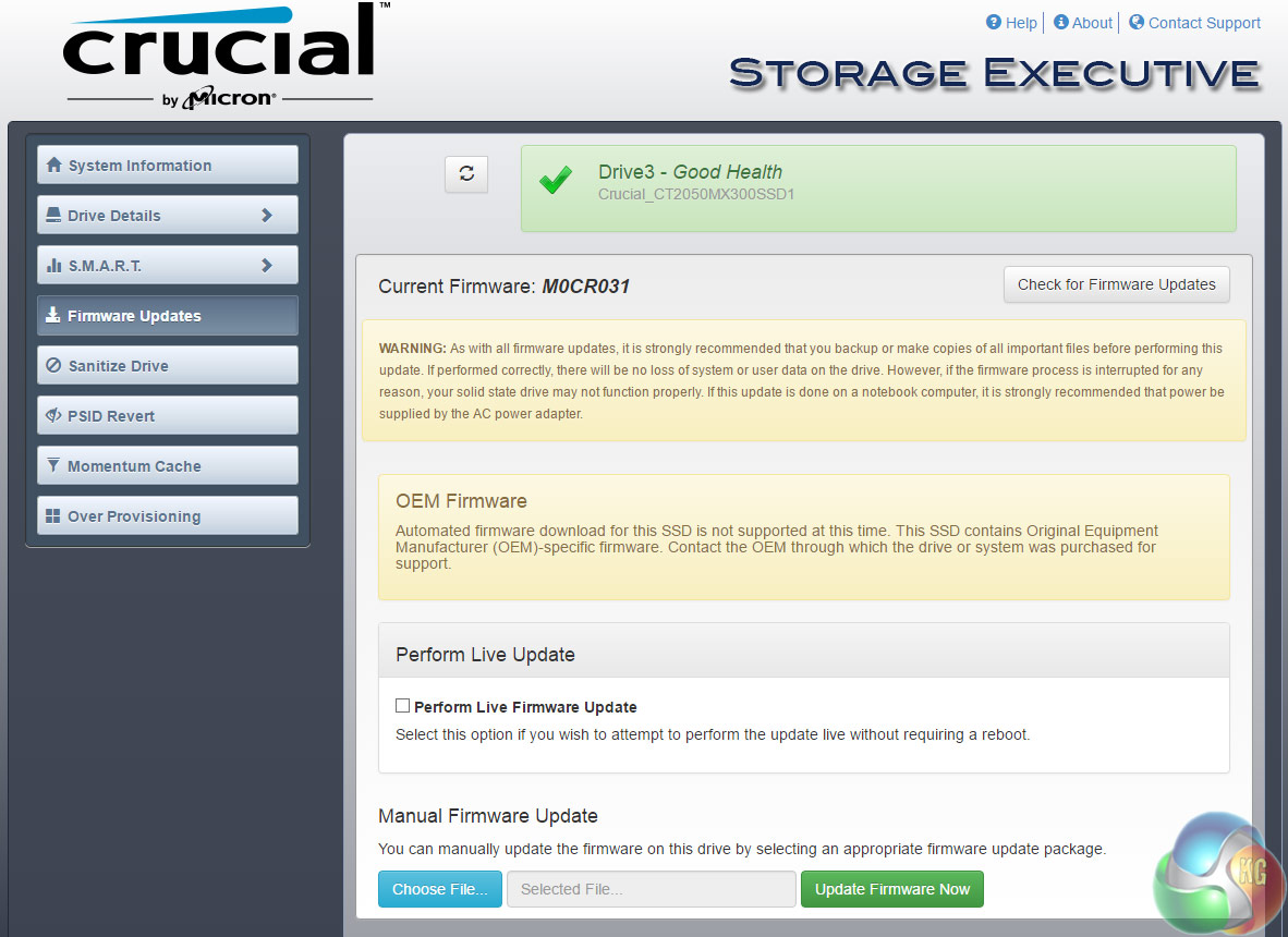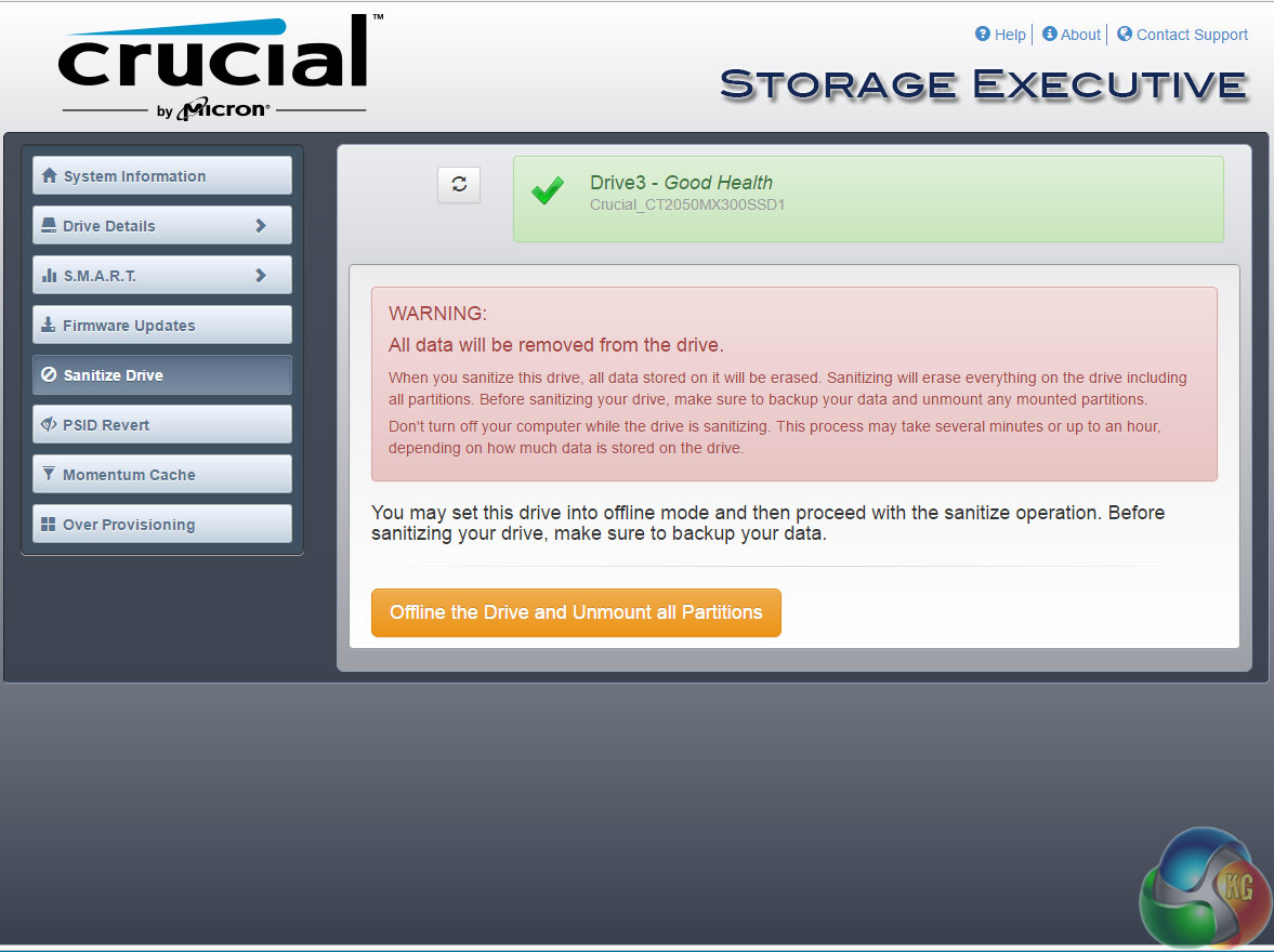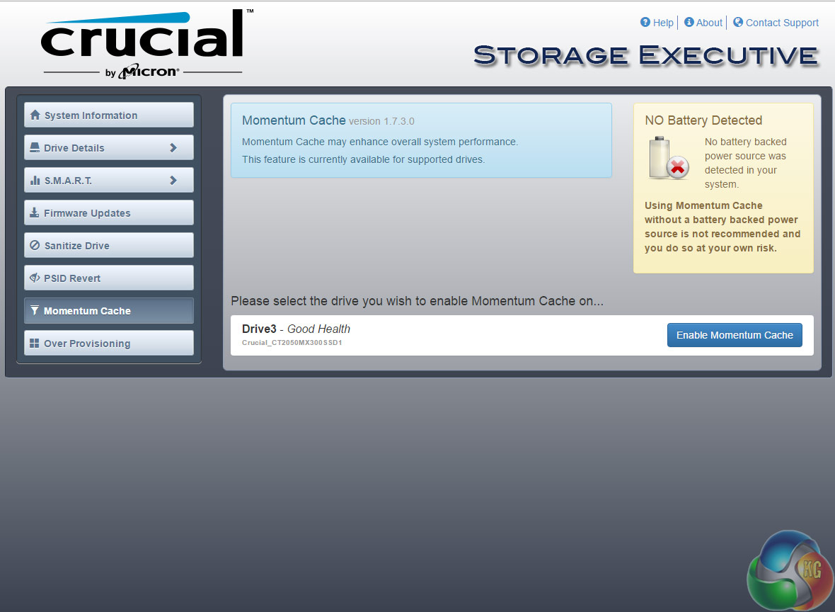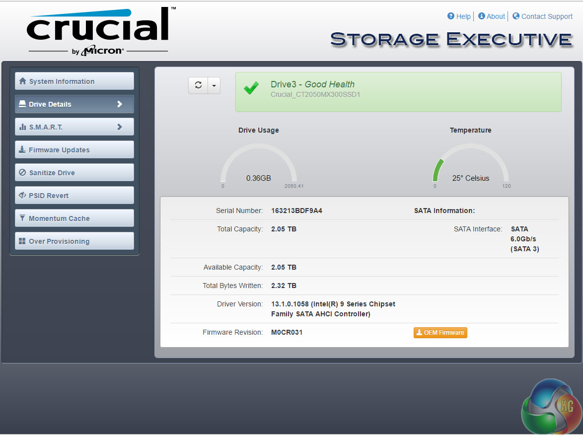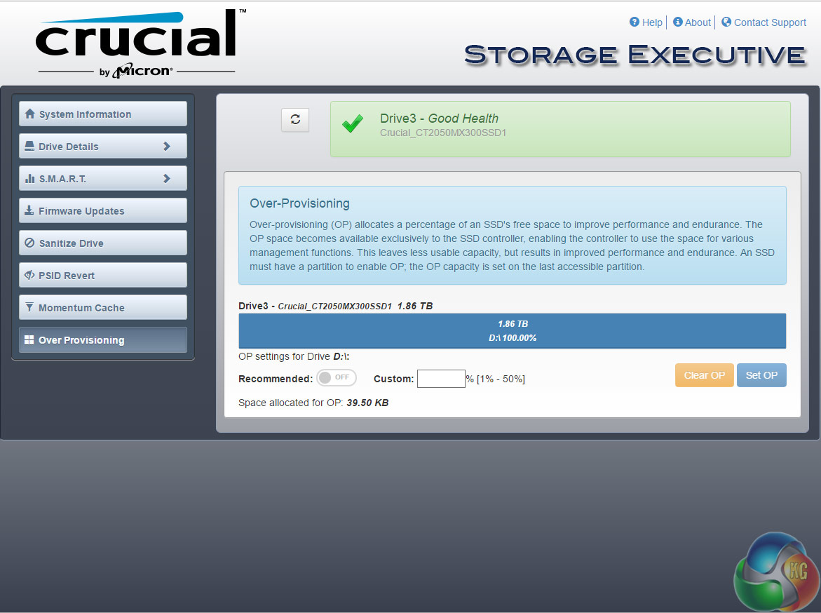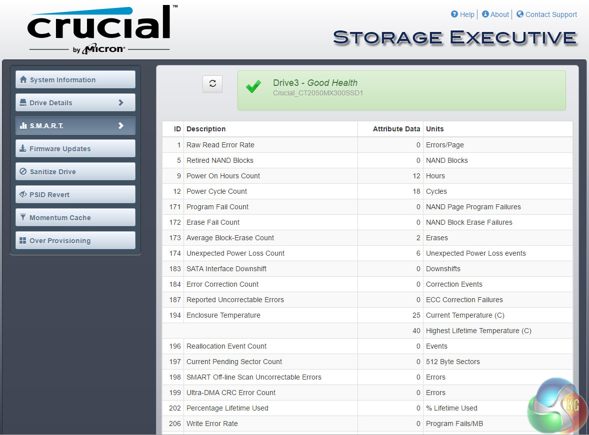 Crucial's SSD management software is Storage Executive. It's a pretty comprehensive utility covering most of what can be tinkered with in an SSD. With it you can check the drive's S.M.A.R.T data, update the firmware, see how the drive's capacity is being used, monitor the drive's operating temperature and overall health, reset the encryption password and enable the Momentum Cache feature.