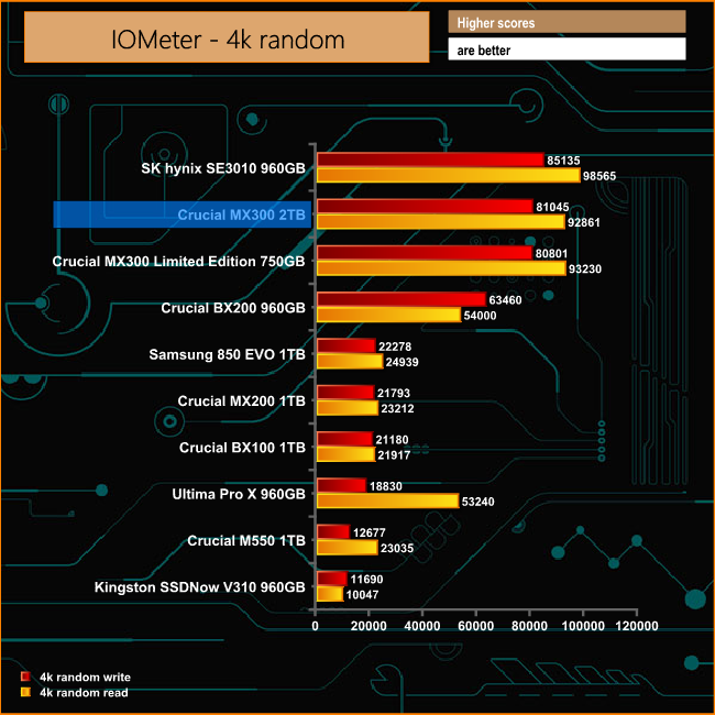 Crucial quote random 4K read/write figures for the MX300 TB as up to 92,000 IOPS for reads and 83,000 IOPS for writes. Under test conditions the drive matched the official read figure, producing a score of 92,861 IOPS while the write figure was a little shy at 81,045 IOPS.